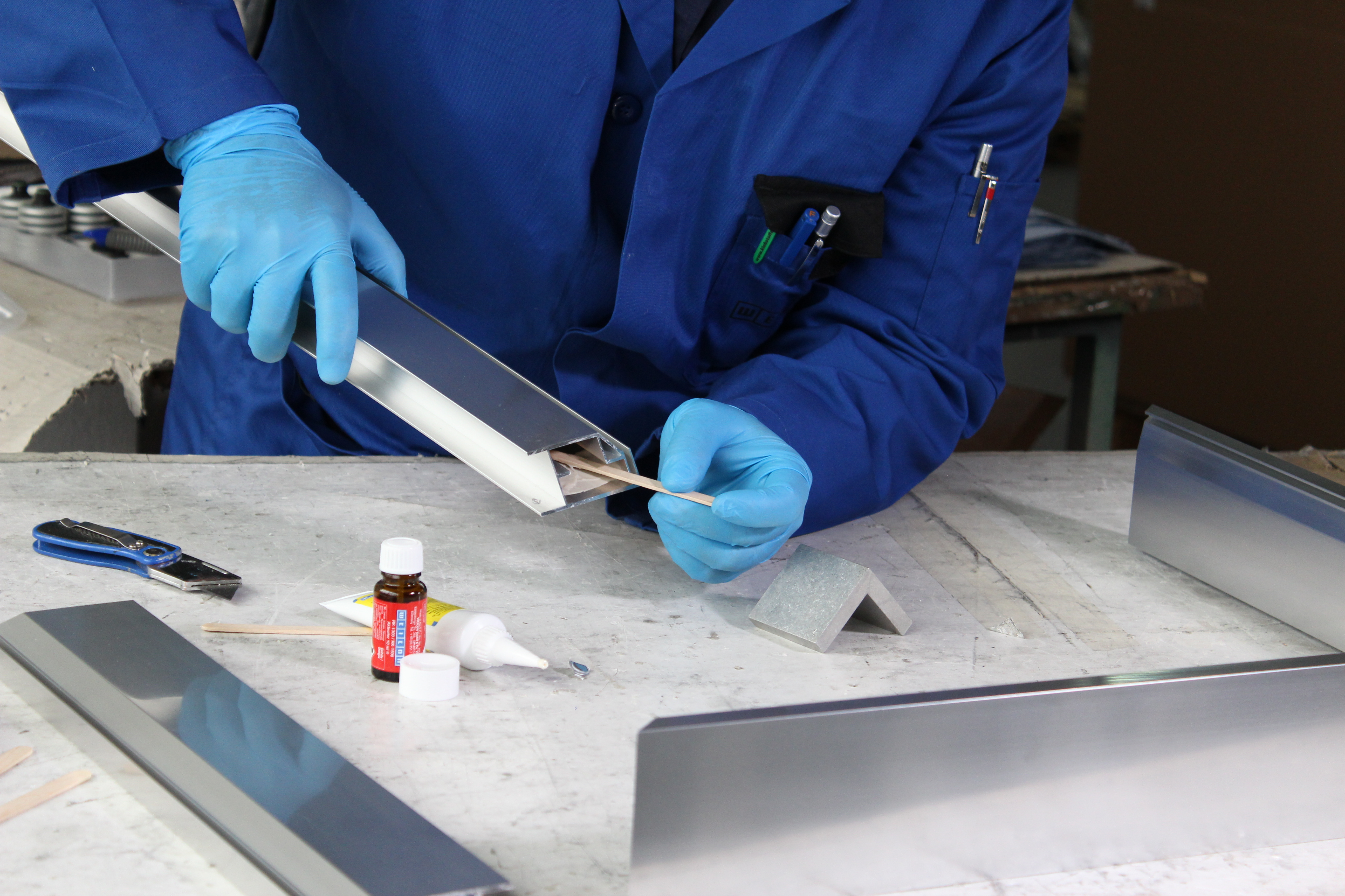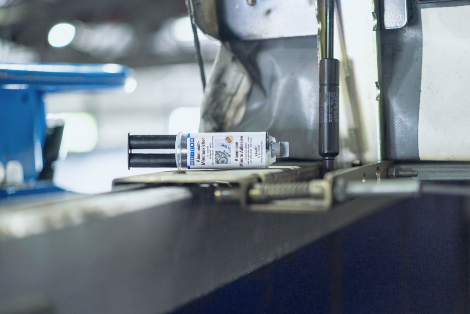 Adhesive for bonding aluminium and other light metals to each other. WEICON Aluminium Minute Adhesive can be used to fill cracks and holes, for example in aluminium housings, and for repairing light alloy wheels. Aluminium Minute Adhesive is a low-odour, two-component, aluminium-filled epoxy adhesive. It is resistant to high temperatures up to +180 °C and cures quickly at room temperature. After curing, the adhesive can be machined (filing, drilling, milling). Aluminium Minute Adhesive is gap-filling and non-dripping (thixotropic) and offers very high tensile and impact strength. To achieve optimal adhesion, the bonding surfaces should be dry and free from grease or dirt. Scraping or sanding the surfaces before cleaning additionally improves adhesion.