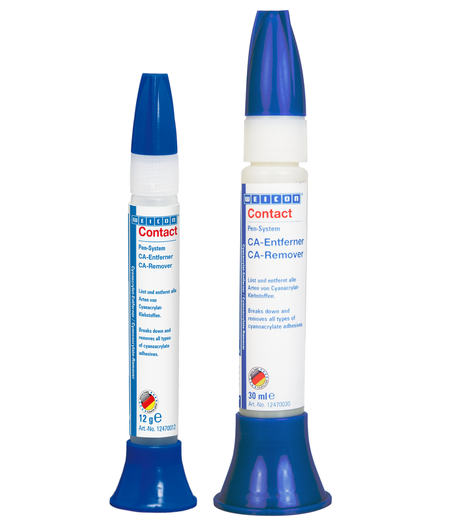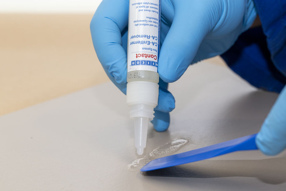 WEICON CA-Remover reliably breaks down and removes all types of cyanoacrylate adhesives. The remover is suitable for cleaning metal parts, tools and many different surfaces that have come into contact with cyanoacrylate adhesives. After a few minutes of soaking in, the dissolved adhesive can be wiped off with a lint-free cloth. In case of stubborn soiling, repeat the procedure. Some plastics, coatings and sensitive surfaces may possibly be damaged by the CA-Remover. Therefore, the material compatibility of the surface should always be tested on a hidden area first. In contrast to other conventional solvents, WEICON CA-Remover is not highly flammable and has a high flash point of >120 °C.