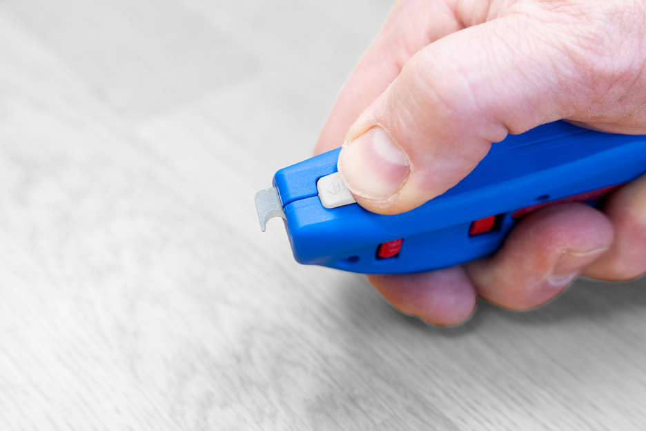 The Cable Stripper No. S 4-28 Spiral is perfect for the precise, fast and safe stripping of all common round cables with a diameter between 4 and 28 millimetres. For cables that cannot be easily stripped using circular and longitudinal cuts, the tool has an additional feature – a spiral cut, which makes it possible to easily remove complex insulation. The rotatable inner blade can be used for circular, longitudinal and spiral cuts on both soft and hard cable insulation. The cutting depth can be comfortably and precisely adjusted in 0.1 mm increments from 0-3 millimetres using a lockable adjusting screw, which prevents damage to deeper layers. The cutting blade is self-rotating and integrated into the housing, allowing for quick automatic switching between circular and longitudinal cuts – only when using the spiral cut, the blade needs to be locked in place. To perform a spiral cut, the function is switched from circular to spiral cut using a setting wheel. Then, by flipping the spiral switch, the internal blade is locked in place, and the cable stripper is ready to make the spiral cut. To switch back to the circular cut, the lock must be released using the spiral switch. The blade will then move freely again, allowing you to carry out the circular cut as usual. After performing the spiral cut, it is advisable to make a small incision at the end of the insulation. It is then easier to peel it off. The tool is equipped with a retractable hook blade for this purpose. The self-retracting safety blade is operated via a slider and automatically retracts in the event of misuse to prevent cutting injuries. This makes the use of the blade much safer compared to fixed blades, such as those in cutter knives.