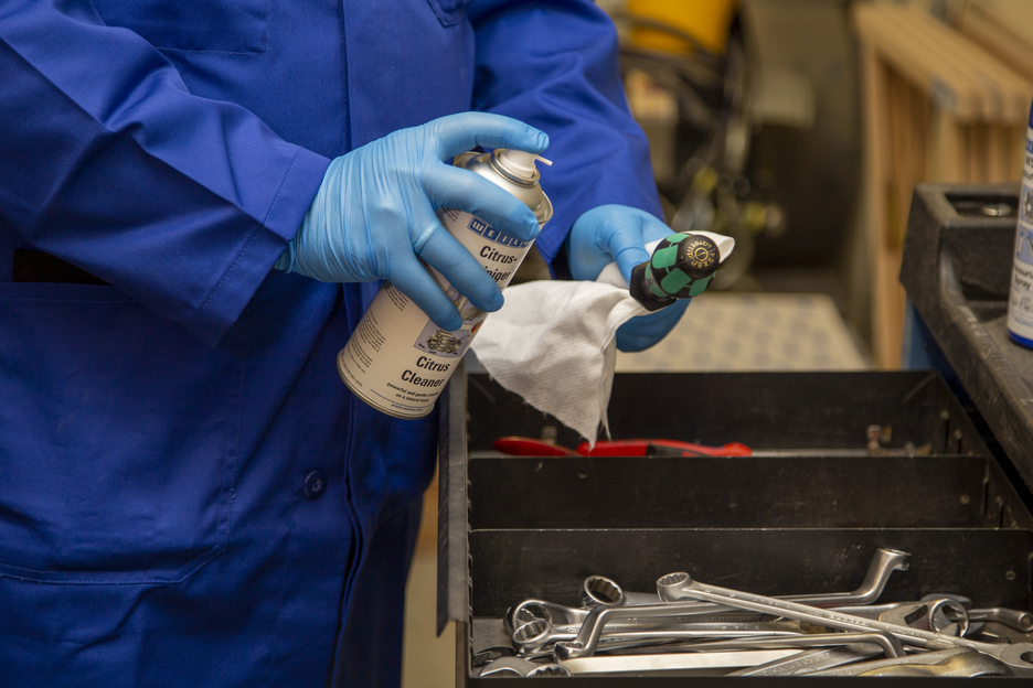 WEICON Citrus Cleaner is an all-purpose cleaner based on alcohol and citrus peel extracts. Thanks to its high isopropanol content of over 75%, WEICON Citrus Cleaner makes use of its disinfectant effect and thus supports the overall cleaning and disinfection of surfaces. It is suitable for all-purpose use and can be used in industry and skilled trades, in window construction, in public facilities and public transport, in construction companies, and around the house. It cleans a wide variety of materials, such as metals and plastics, glass, ceramic as well as painted and coated surfaces*. WEICON Citrus Cleaner also achieves a high level of effectiveness and reaches high efficiency in basic hygiene and the support of additional hygiene measures, the cleaning of frequently used hand tools, soiling caused by pencils, ballpoint pens and felt-tip pens. *For safety reasons, the material compatibility should first be checked on a non-visible area.