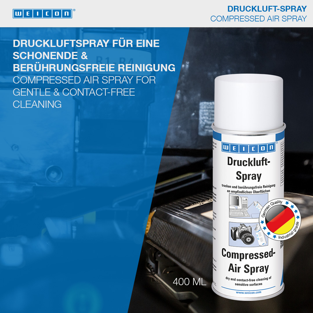 WEICON Compressed-Air Spray can be used wherever dust cannot be easily removed by conventional methods and on parts which are difficult to reach. It allows dry and contact-free cleaning of inaccessible corners and sensitive surfaces. Compressed-Air Spray can be used on HiFi and video devices (e.g. modules, circuit boards, magnetic heads, hard drives etc.), in optics (e.g. on cameras, objectives, lenses), on car fuse boxes and wiper units, on clockworks (quartz clocks), in medical technology, model making, measurement technology, on electronic components and circuit boards.