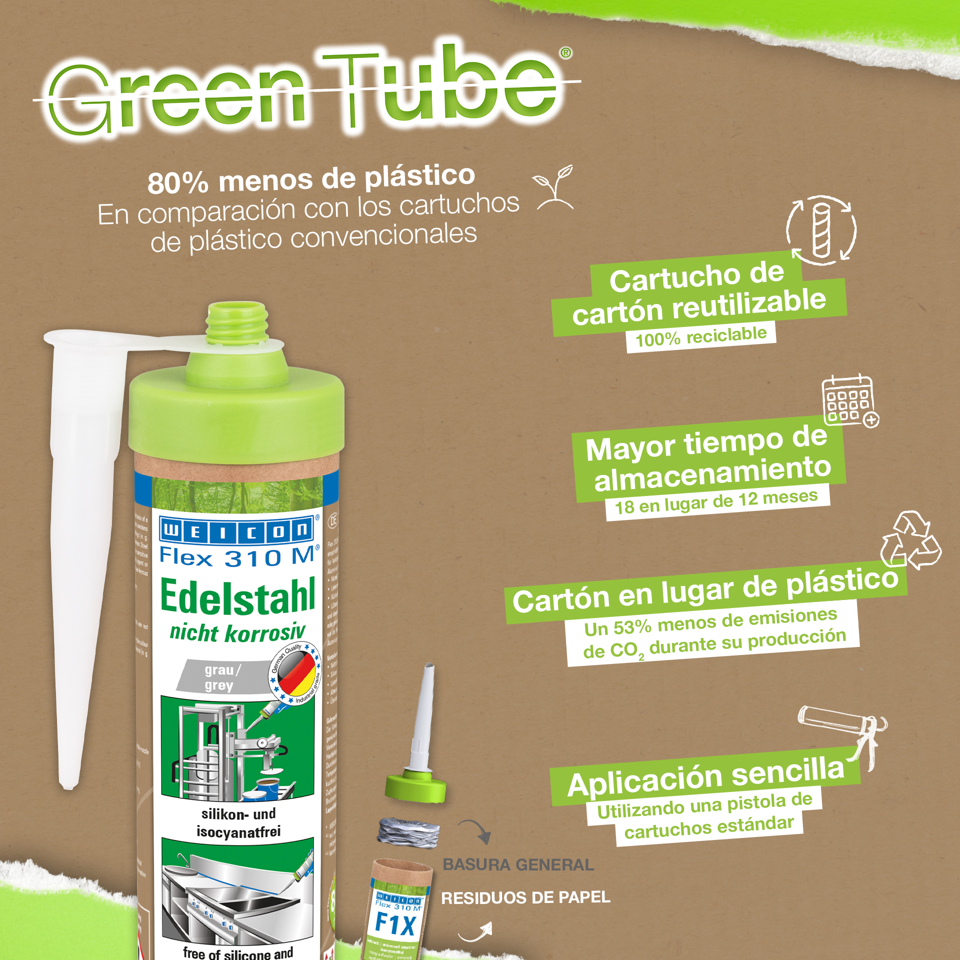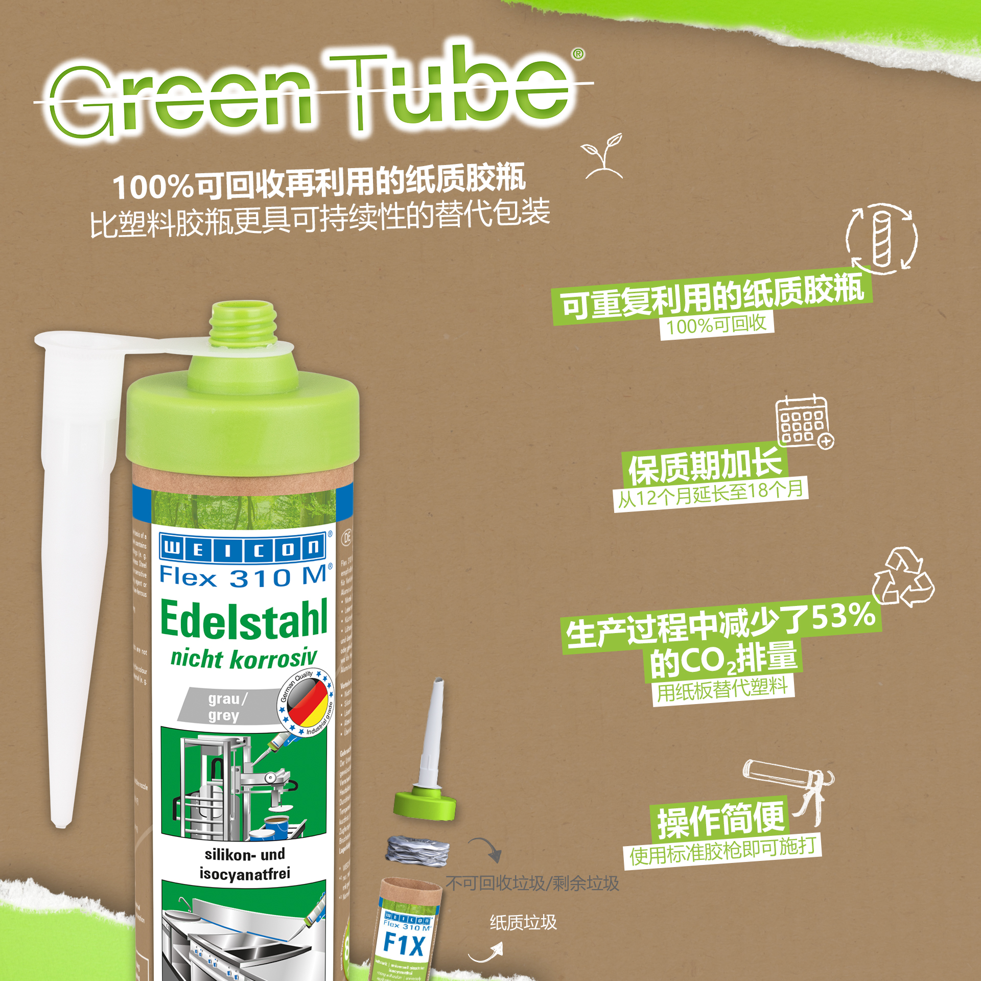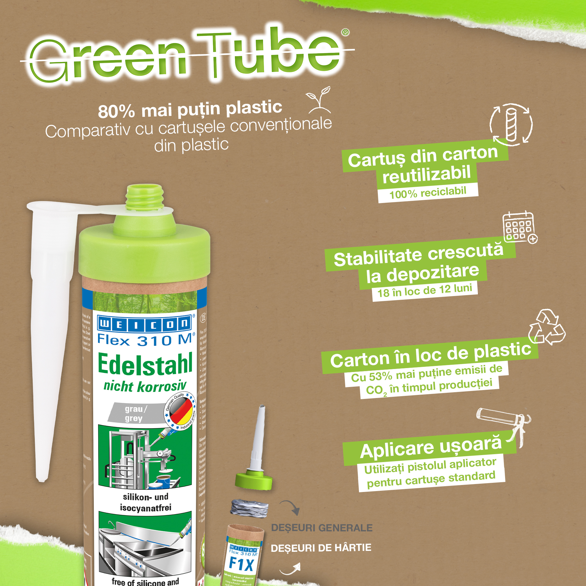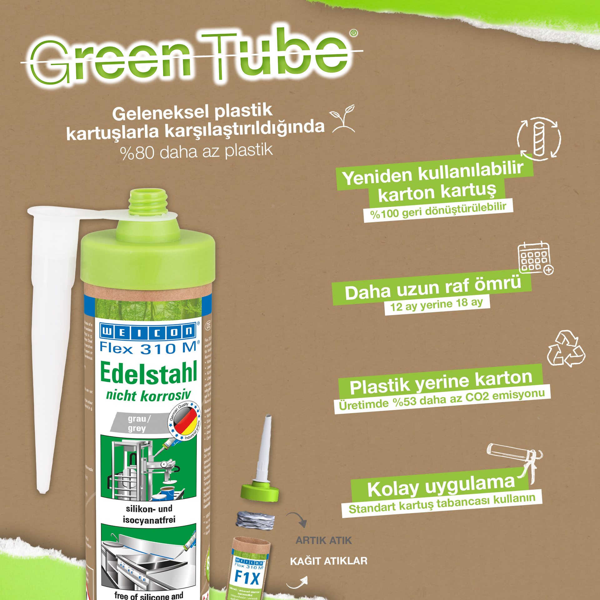 WEICON Flex 310 M Stainless-Steel Adhesive and Sealant is non-corrosive, strong, paintable (wet in wet), sandable, resistant to ageing and UV radiation and is free of silicone, isocyanate, halogens or solvents. The product as an ISEGA certificate and can be used as an adhesive in the food technology. Flex 310 M Stainless Steel is an elastic adhesive based on MS polymer and is suitable for bondings as well as seam and joint sealing on metals, such as stainless steel, aluminium and non-ferrous metals. It can also be used in all application areas where the colour of the adhesive and sealant must match the surface material (e. g. stainless steel, aluminium, etc.). WEICON Flex 310 M Stainless-Steel can be used in metal construction, tank and apparatus engineering, in the food industry, in kitchen and sanitary installations, ventilation and air conditioning systems, and in all applications where silicones or products containing silicones are not suitable.