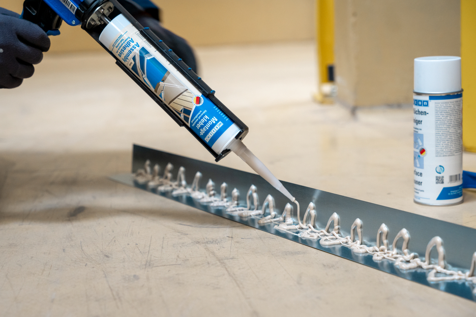 Adhésif de contact rapide et à forte adhérence à base de caoutchouc synthétique pour les collages à l'intérieur et à l'extérieur. La colle de montage élastique monocomposante peut être utilisée sur de nombreux matériaux, tels que le bois et les panneaux de fibres de bois, les panneaux MDF et OSB, les panneaux décoratifs, l'acier, l'aluminium, le plastique, le PVC, le plâtre, le placoplâtre, la céramique, la maçonnerie, le carrelage, la pierre ainsi que le béton. La colle convient pour la fixation rapide et durable de plinthes, de panneaux, d'éléments de sol, de revêtements muraux, de sols de fenêtres, de seuils de portes, de portes en bois, de profilés décoratifs et bien plus encore.