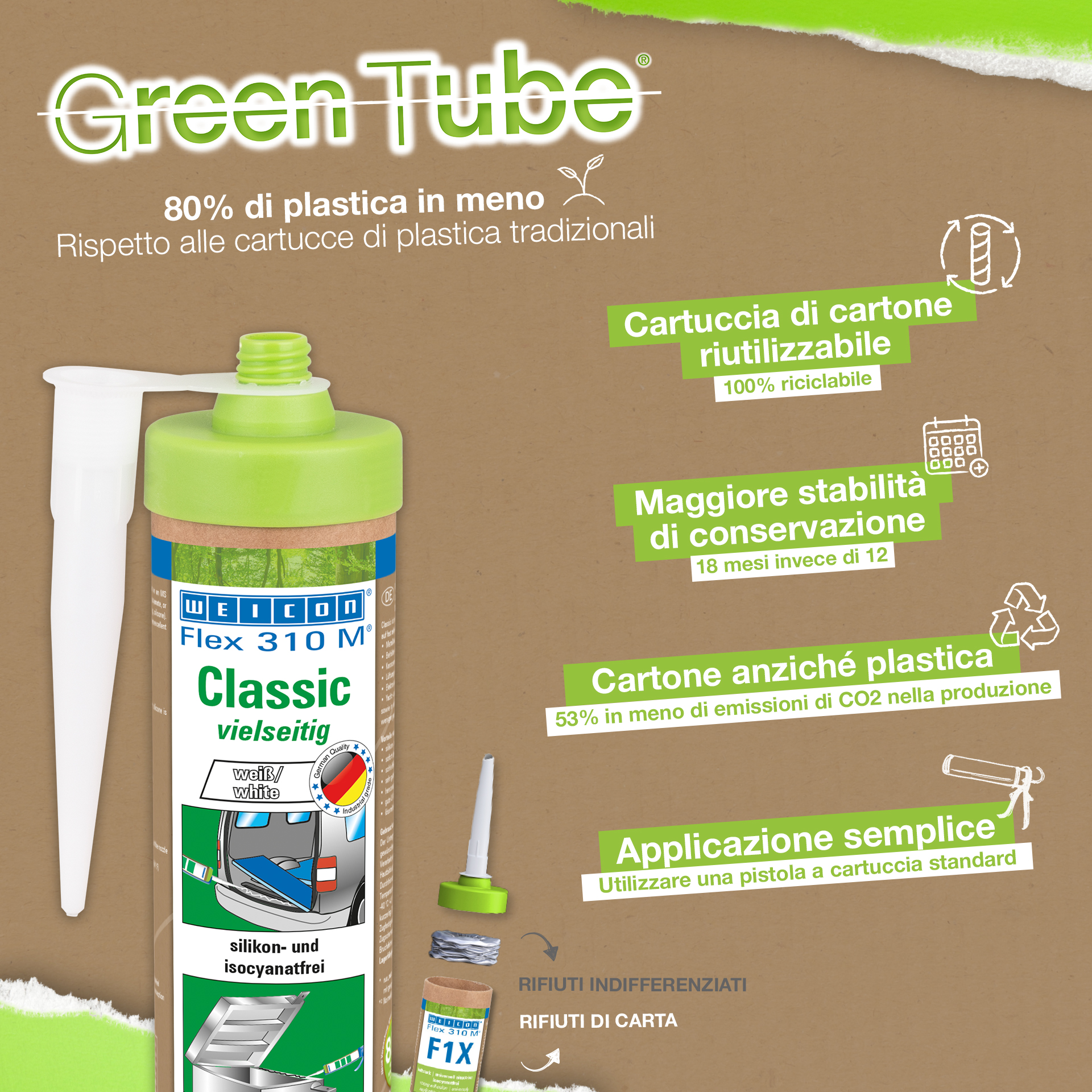 WEICON Flex 310 M Classic est fortement adhésif, peut être peint «mouillé sur mouillé». Il peut être poncé, il possède une excellente résistance au vieillissement et une bonne stabilité aux UV. Il est résistant à l'eau douce ou salée, exempt de silicone, d'isocyanate, d'halogènes et de solvants. Le produit est certifié ISEGA et s'utilise comme adhésif en technologie alimentaire. Flex 310 M Classic est un adhésif élastique à base de polymères MS qui convient pour assembler des métaux, de nombreuses matières plastiques, la céramique, le bois, le verre et la pierre. Le scellant adhésif s'utilise dans la construction métallique, la chaudronnerie, la construction d'appareils, en carrosserie, dans la construction de véhicules et de containers, dans la ventilation et la climatisation, dans l'industrie électrique, dans la construction de yachts et de bateaux et partout où des silicones ou des produits contenant des silicones ne conviennent pas.