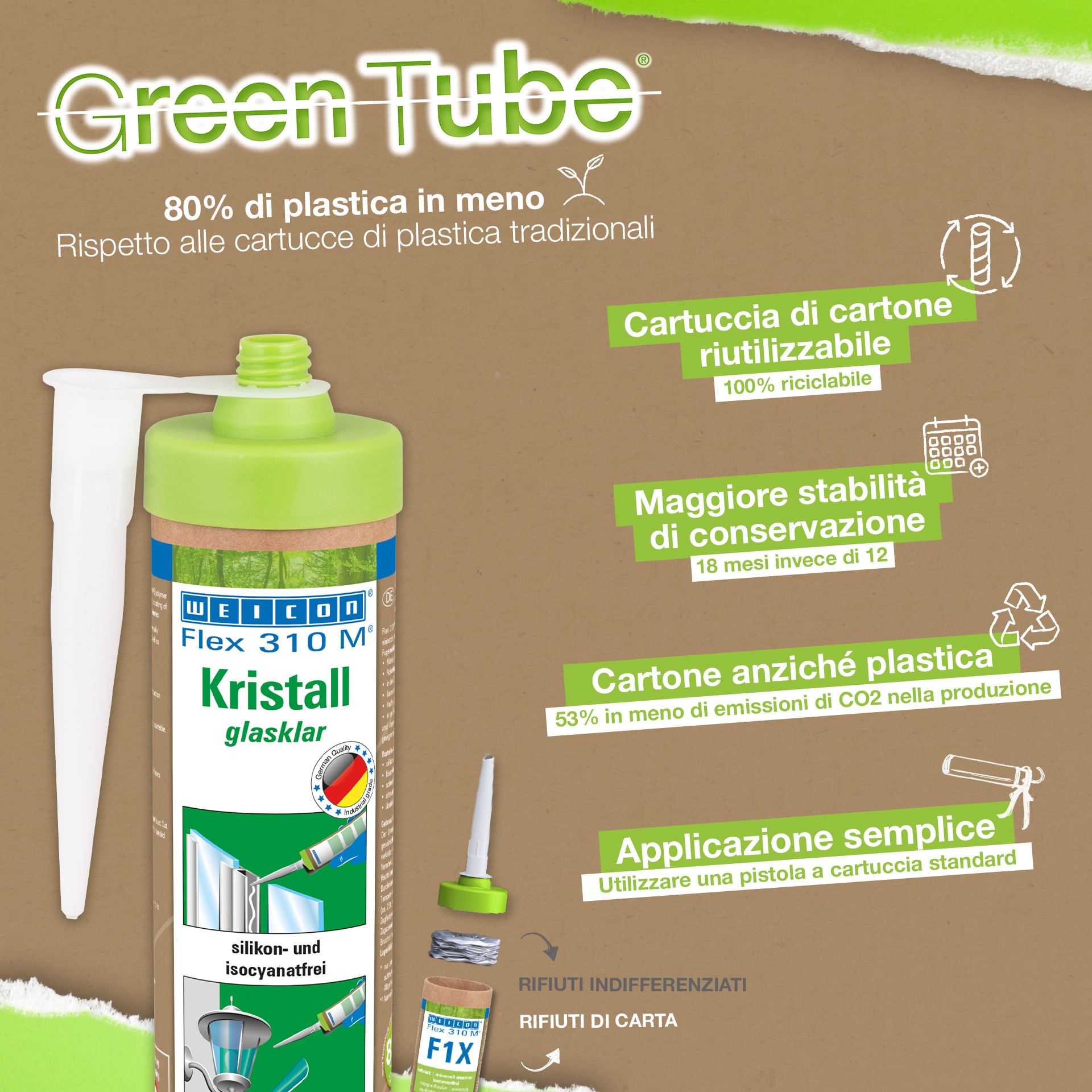 WEICON Flex 310 M Cristal est transparent, fortement adhésif, peut être peint «mouillé sur mouillé» et poncé. Il possède une excellente résistance au vieillissement, une bonne stabilité aux UV, il est résistant à l'eau douce et à l'eau salée, exempt de silicone, d'isocyanate, d'halogènes et de solvants. Il est certifié ISEGA et s'utilise comme adhésif en technologie alimentaire. Flex 310 M Cristal est un adhésif élastique à base de Polymères MS et convient pour assembler le verre, le PC*, le PMMA* et le verre acrylique*, les métaux, de nombreuses matières plastiques, la céramique, le bois et la pierre. Une fois durci, le produit est limpide et convient particulièrement pour les assemblages élastiques où l'adhésif peut ou doit rester invisible. Il s'utilise dans la transformation des matières plastiques, la construction métallique, la chaudronnerie, la construction d'appareils, la ventilation et la climatisation, l'industrie électrique et des luminaires, la construction de stands d'exposition et l'agencement de magasins et partout où les silicones ou les produits siliconés sont inappropriés. (* = Coller seulement sans tension)