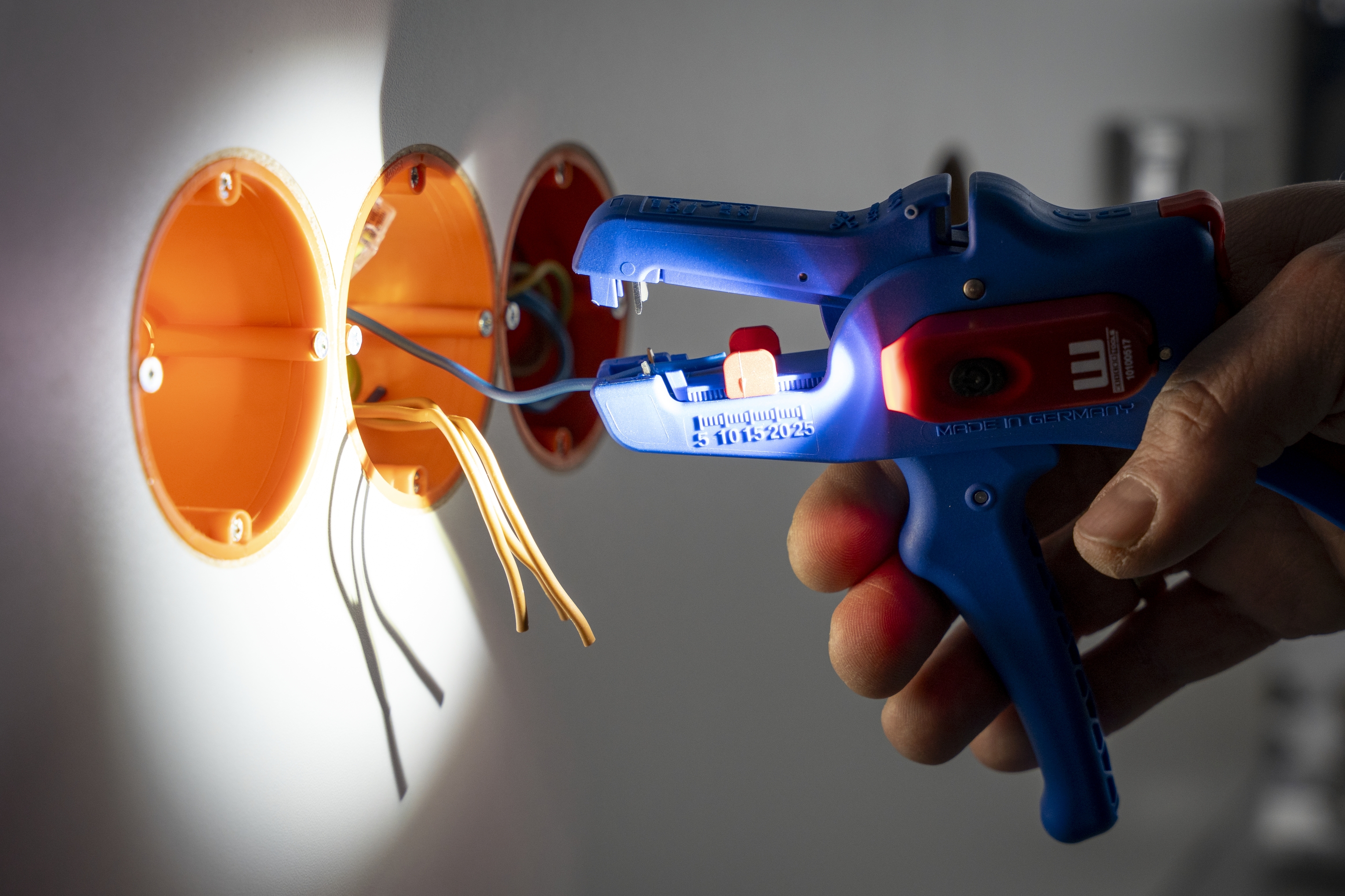 The small, compact light illuminates the stripping blades of the wire strippers in a targeted manner, thus directly illuminating the area of application. In this way, the work light also contributes to occupational safety during electrical installation. The LED light has been specially designed to meet the needs of professional users and is used in both trade and industry.