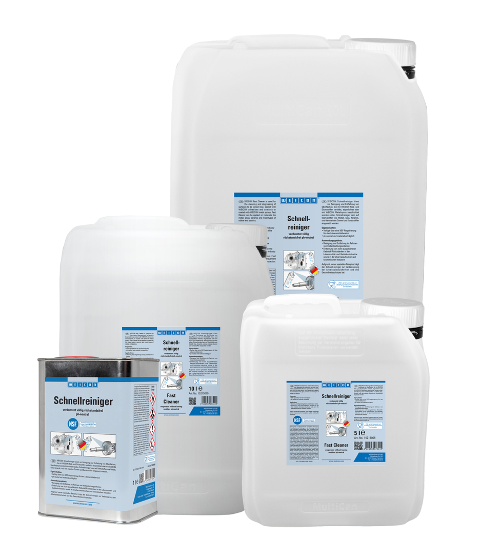 Le Nettoyant Rapide est enregistré auprès de la NSF pour l‘utilisation dans le secteur alimentaire. Il peut donc servir à nettoyer, dégraisser et ôter la saleté lors de travaux de maintenance et à éliminer les adhésifs dans l‘industrie agroalimentaire, dans l‘industrie de l‘alimentation et des boissons ainsi que dans l‘industrie pharmaceutique et cosmétique. Le Nettoyant Rapide est utilisé pour nettoyer et dégraisser des surfaces destinées à être assemblées ou étanchées à l’aide de scellants adhésifs WEICON ou avant l‘application par pulvérisation d‘un revêtement métallique WEICON. Avec un pH neutre, compatible avec la plupart des matériaux, le Nettoyant Rapide peut être appliqué sur de nombreux substrats, par ex. les métaux, le verre, la céramique et la plupart des caoutchoucs et des matières synthétiques. En raison de sa formulation spéciale et de son enregistrement auprès de la NSF qui en découle, le Nettoyant Rapide peut contribuer à améliorer la sécurité et la protection de la santé au poste de travail.