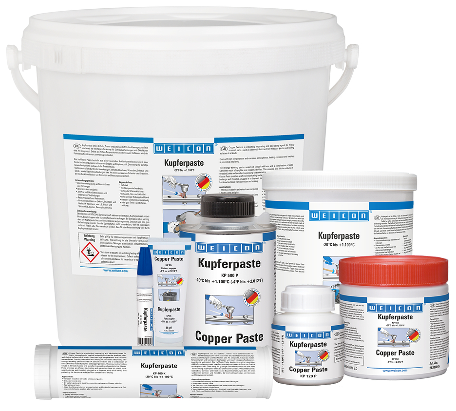 WEICON Pâte Cuivre est un agent protecteur, séparateur et lubrifiant. Elle résiste aux hautes températures et à la corrosion, possède un fort pouvoir d'adhérence et est exempt de soufre, de plomb et de nickel. La Pâte Cuivre s'utilise comme lubrifiant de montage pour des assemblages vissés et des surfaces de glissement en tous genres. Il forme un film lubrifiant et séparateur efficace sur les douilles d'usure, vis, assemblages vissés, enfichés et à baïonnette en tout genre, qui protège les surfaces fonctionnelles contre la corrosion et la rouille d'ajustage. Elle s'utilise pour réduire les vibrations sur les sabots de freins et les coulisses, les cames et les tiges de freins, sur les bornes des batteries de véhicules à moteur ainsi que sur d'autres connexions électriques, sur les vis ou les écrous de roue et sur les douilles d'usure des marteaux électriques, pneumatiques et hydrauliques.