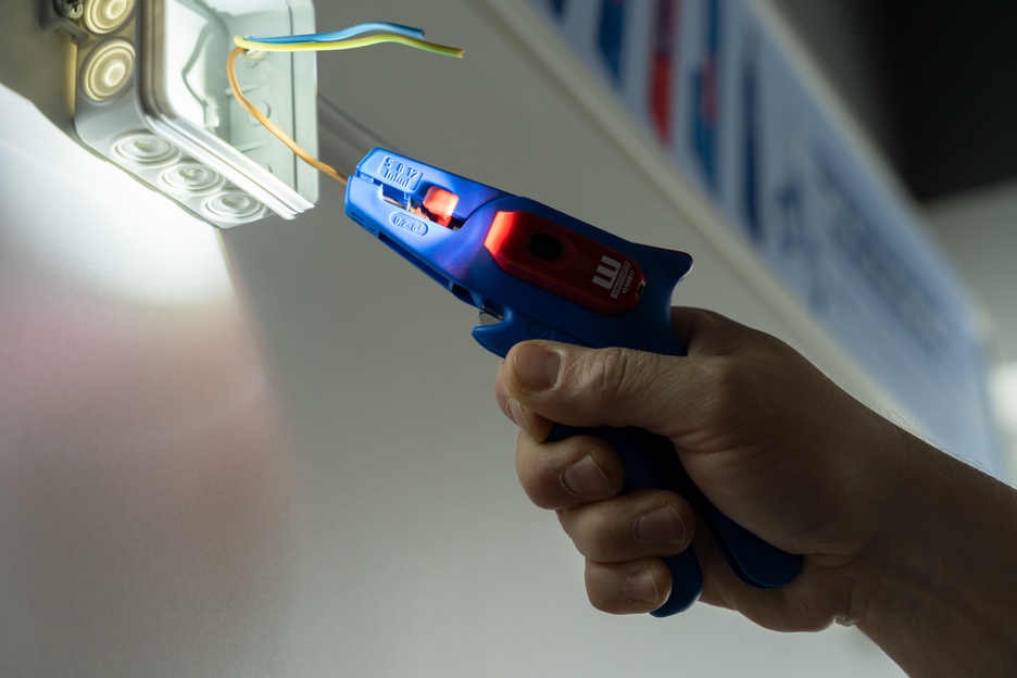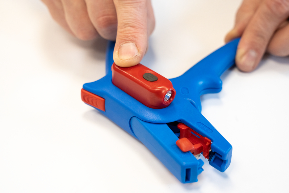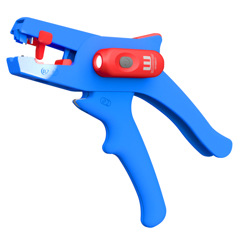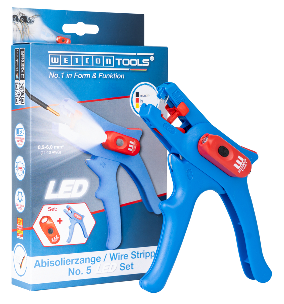 Wire Stripper No. 5: automatic wire stripper for all common stranded and solid conductors (0.2 – 6.0 mm²) I very easy to operate I precise working thanks to adjustable length stop (5 - 12 mm) I LED Work Light: the integrated LED light ensures a well-illuminated working area that allows you to work safely with both hands I powerful and rechargeable lithium battery with 180 mAh I 2 hours of bright light (at level 2) after a charging time of 40 minutes I three brightness settings with up to 250 lumens, light colour: 6500K I dustproof, splash-resistant and impact-resistant housing made of polycarbonate, tested acc. to IP65 protection code I can be used with many WEICON TOOLS wire strippers