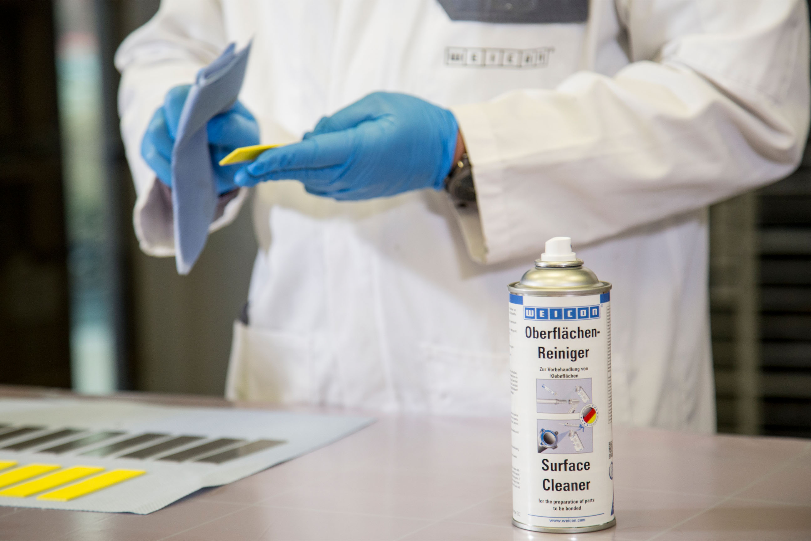 En effet, les graisses, huiles, poussières, salissures ou sprays silicone altèrent considérablement l'efficacité de l'adhésif. Chaque particule de graisse ou de saleté restant sur la surface sera collée et séparera le composant à coller de l'adhésif. Pour un nettoyage efficace, il est préférable d'utiliser un spray nettoyant spécifique. Selon la sensibilité de la surface ou la gravité de la salissure, nous recommandons un nettoyant doux ou puissant.