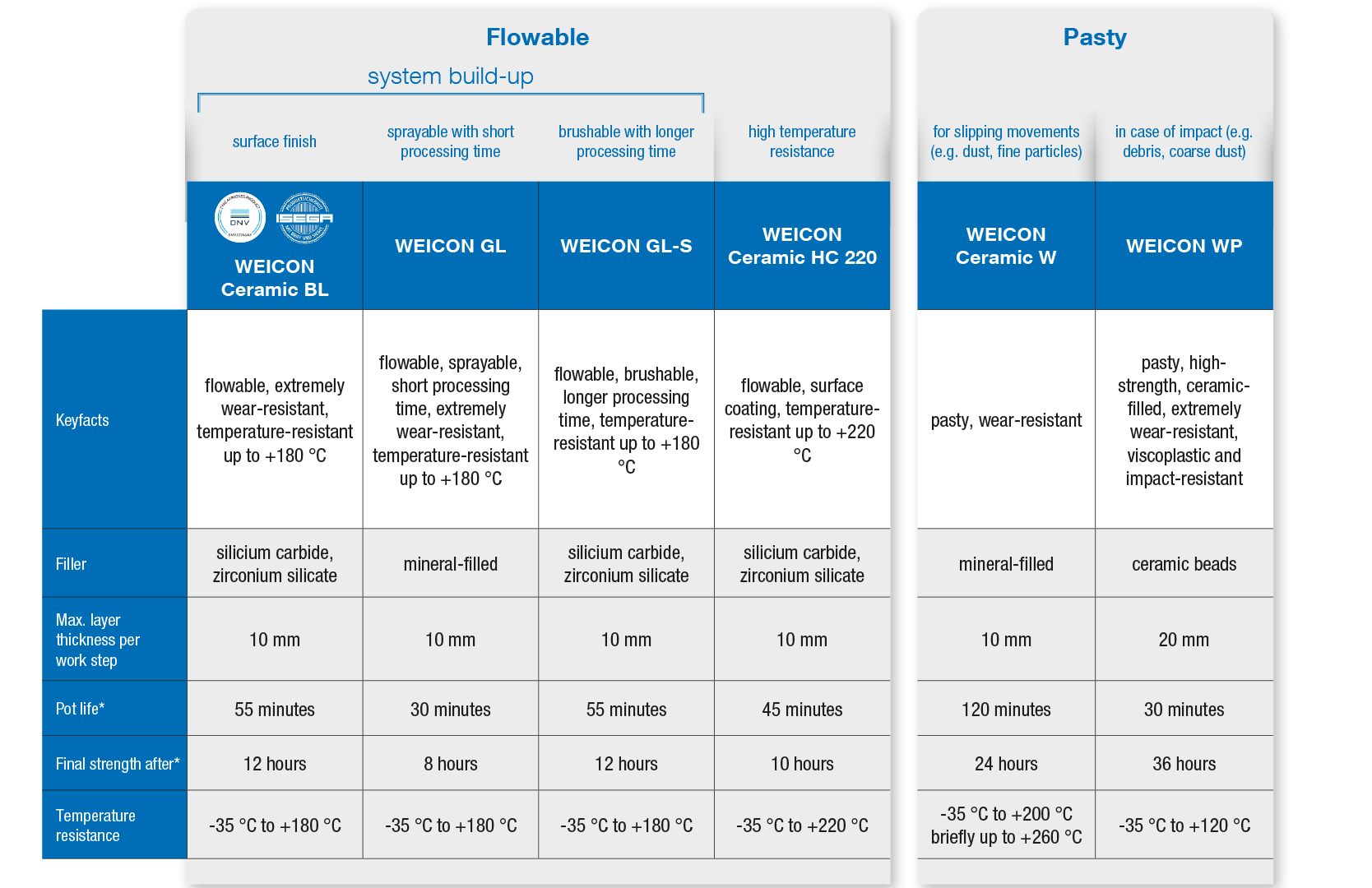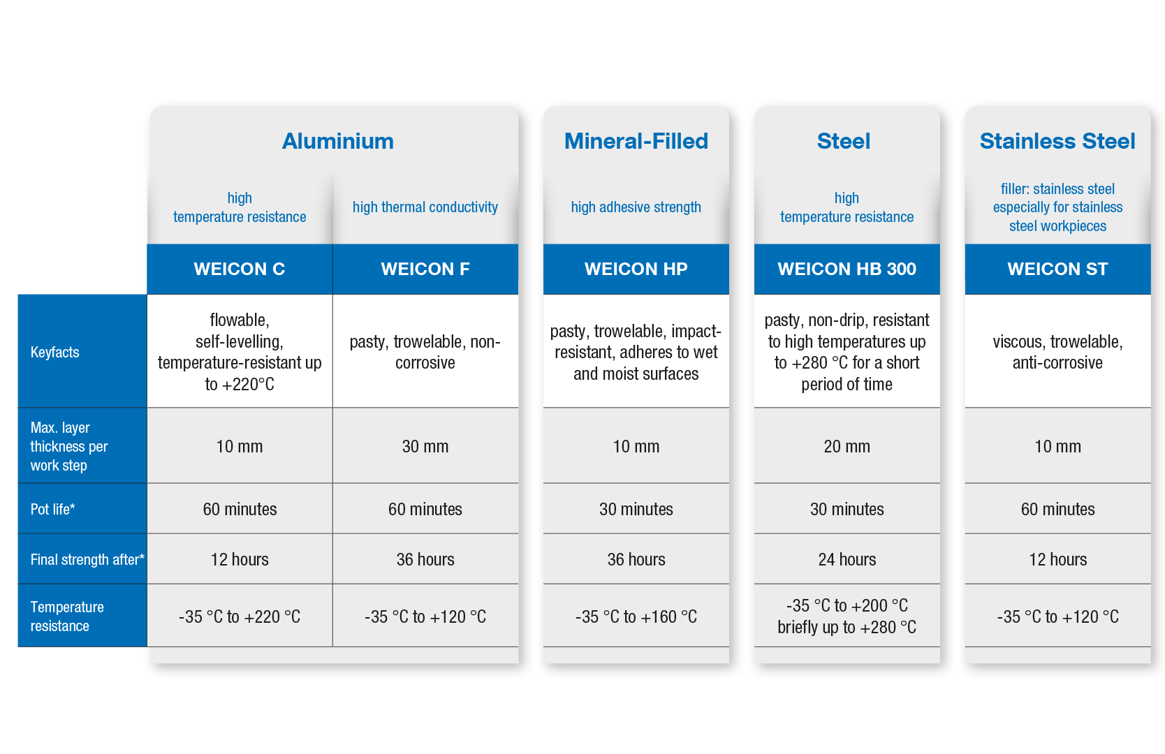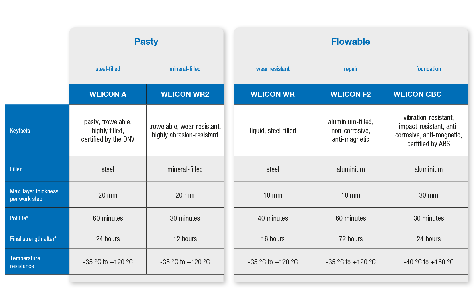 WEICON propose toute une série de produits qui peuvent être utilisés comme masse de scellement, pour le doublage et le rebasage ainsi que pour l'égalisation des fentes. En outre, ils sont utilisés dans la fabrication de prototypes ou de dispositifs de retenue. Les produits spéciaux peuvent également être utilisés pour réparer des convoyeurs, des glissières ou des rails de guidage. Les résines époxy apportent un remède dans la construction métallique, la construction de voies ferrées, sur les grues et dans la réparation de ponts. Les avantages de ces systèmes de réparation sont une grande fluidité, une adhérence élevée ainsi qu'une très bonne résistance à la pression. Elles offrent en outre une protection anticorrosion de longue durée.