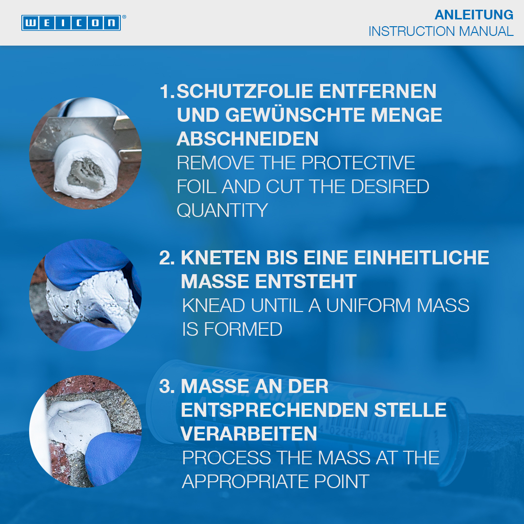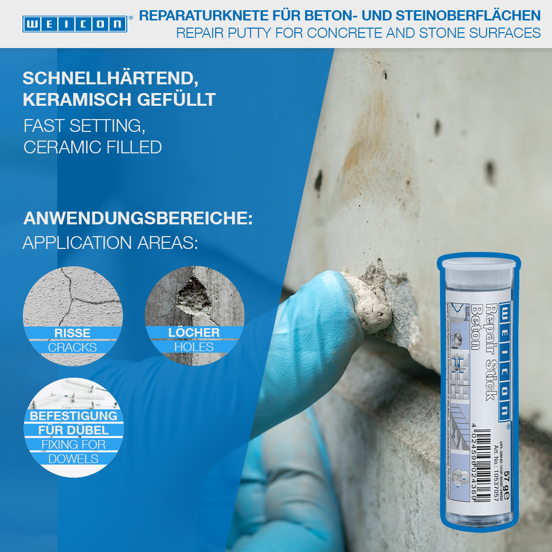 Spécialement conçu pour les réparations et les retouches rapides de toutes les surfaces en béton, en pierre et en céramique. Remplit et bouche les fissures et les endroits défectueux sur la maçonnerie, les dalles de pierre, de béton et de céramique, les briques, les bordures et les pierres d'encadrement, les statues, les pierres tombales et les ornements et peut être utilisé pour la fixation supplémentaire de chevilles, de vis et d'ancrages à l'intérieur et à l'extérieur. WEICON Repair Stick Béton peut être utilisé dans la construction, l'horticulture, l'aménagement paysager et dans de nombreux autres domaines.
