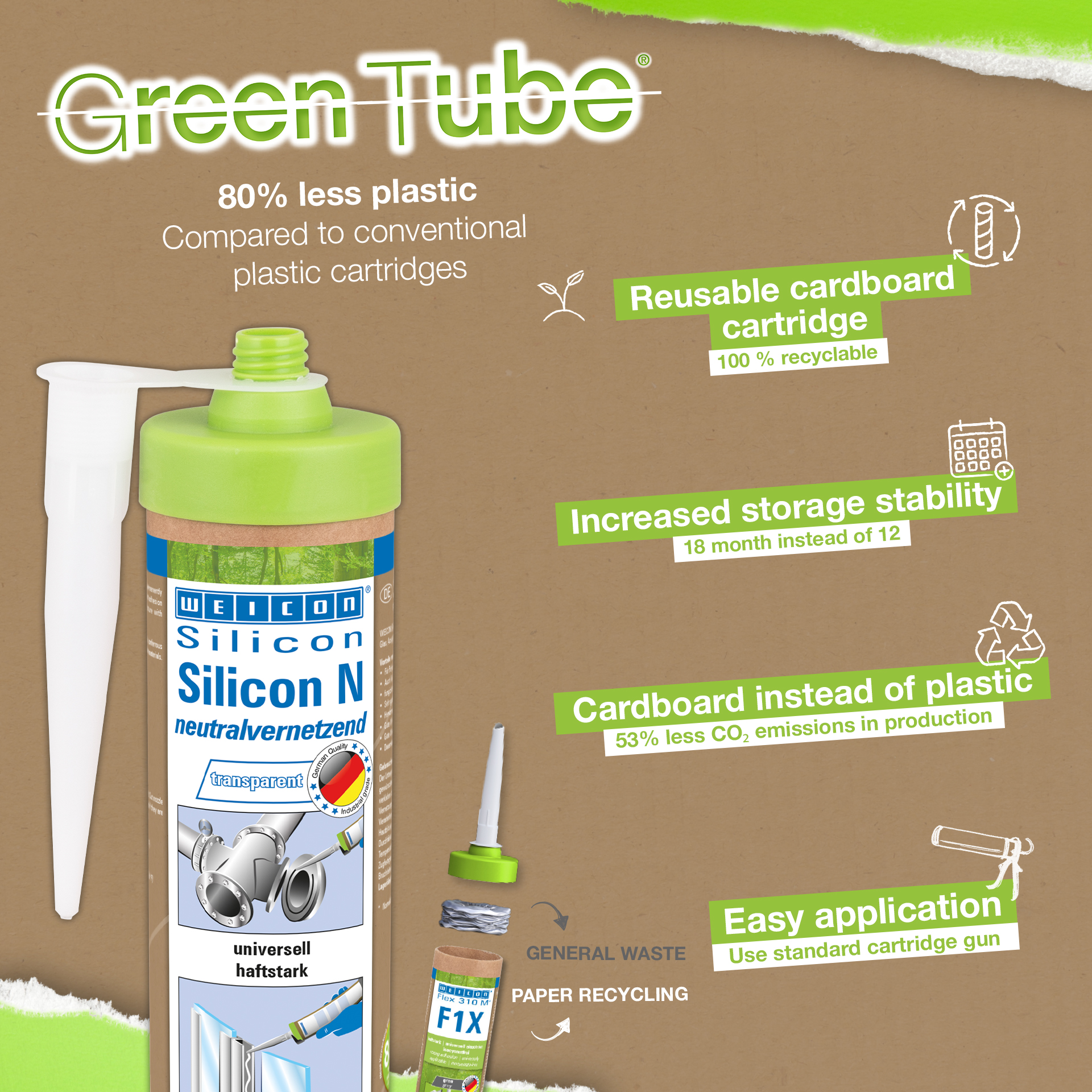 WEICON Silicone N est exempt de solvants, à réticulation neutre, non corrosif, à forte adhérence, durablement et extrêmement élastique (allongement à la rupture d'env. 550%), résistant aux intempéries, aux agents chimiques et à la chaleur jusqu'à +180 °C(+356 °F) et universellement utilisable. Silicone N adhère très bien à tous les métaux, au verre, à la céramique et à de nombreux autres matériaux. Silicone N s'utilise dans la plasturgie, l'industrie électrique, la technique énergétique, l'industrie des luminaires, l'agencement de stands d'exposition et de magasins et dans beaucoup d'autres domaines industriels.
