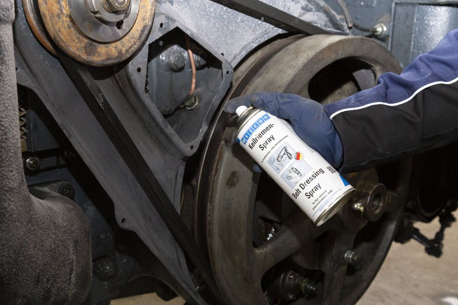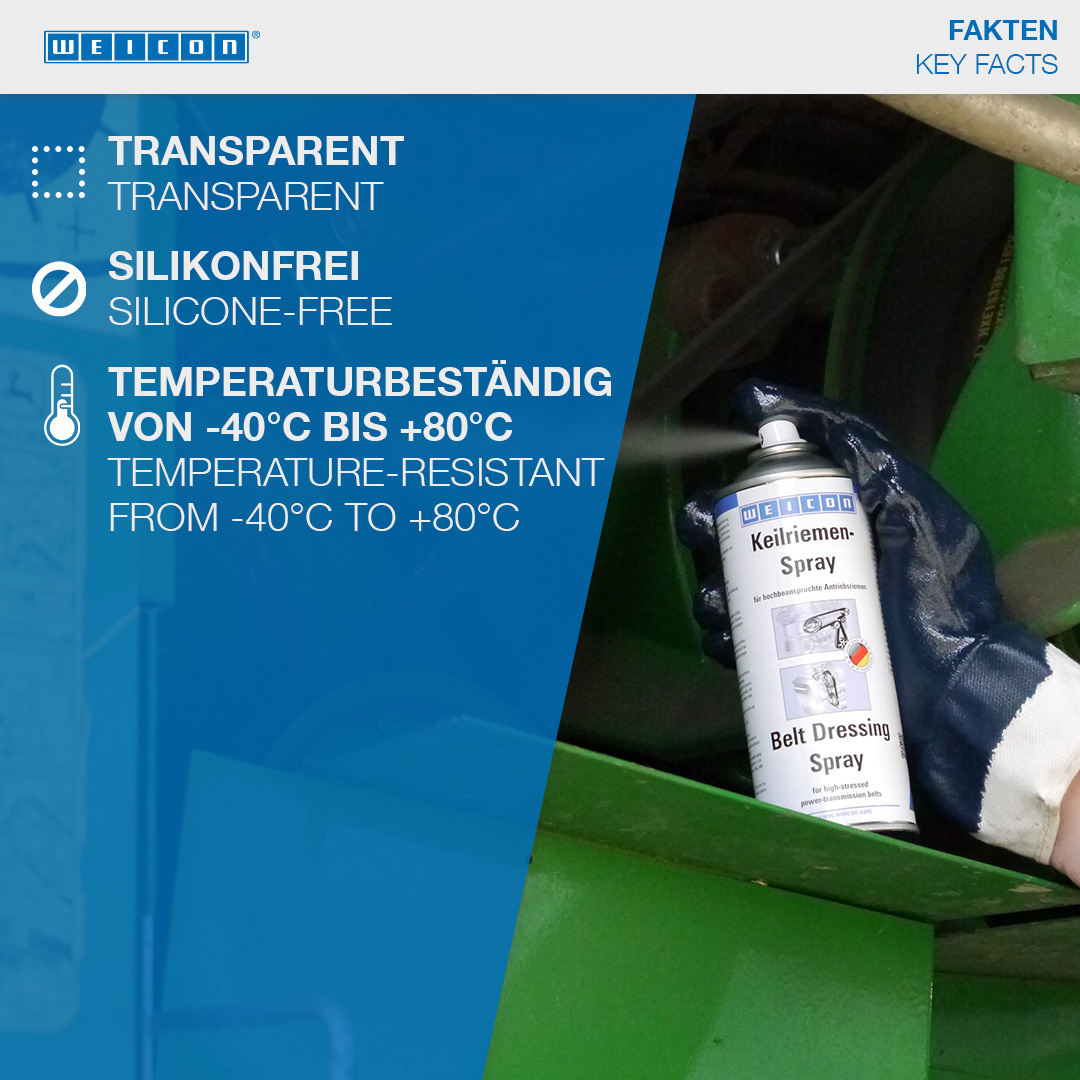 Le Spray WEICON pour Courroies de Transmission est un revêtement transparent à base d'élastomères synthétiques pour courroies de transmission fortement sollicitées de toutes sortes. Il augmente la durée des courroies, prolonge la durée de vie des machines et installations, prévient le patinage de la courroie, transmet la pleine puissance d'entraînement, élimine et prévient les grincements, pénètre à l'intérieur des pores, augmente le rendement de la force de traction, accroît le frottement et l'adhésion, empêche la charge statique, assouplit et protège contre le vieillissement. Le Spray WEICON pour Courroies de Transmission s'utilise pour tous les types de courroies et rubans en matières courantes, p. ex. en tissu, cuir, caoutchouc ou PVC. Il s'utilise pour les courroies trapézoïdales, les courroies trapézoïdales à sections, courroies d'entraînement, courroies plates, rondes, crantées, courroies de transmission, striées ou rubans transporteurs. Le Spray WEICON pour Courroies de Transmission convient particulièrement à tous les types de courroies de machines, groupes de machines, compresseurs, pompes, générateurs, convoyeurs, moulins, perceuses à colonnes et réfrigérateurs. Respecter les dispositions de sécurité applicables lors de l'utilisation sur des machines en marche.