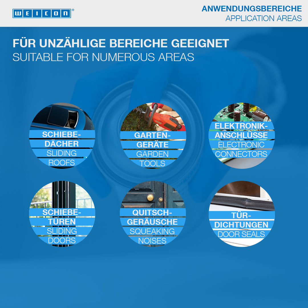 WEICON Spray Silicone est un agent antiadhésif et lubrifiant et séparateur qui protège et entretient les plastiques, le caoutchouc et les métaux. Le spray dépose un film antiadhésif de longue durée qui assure une bonne texture superficielle et résiste à la chaleur jusqu‘à +250°C (+482°F). Spray Silicone empêche la formation de résidus d‘adhésifs sur les presses et les guidages, évite que les marchandises ne collent sur les convoyeurs à bande, les caniveaux et les toboggans, protège les contacts électriques contre l‘humidité, entretient les pièces en caoutchouc, matière plastique et métal, empêche les pièces en caoutchouc de devenir fragiles, d‘adhérer sous l‘effet du froid ou de coller et garantit le fonctionnement impeccable des glissières de toits ouvrants et de sièges, des enrouleurs de ceintures de sécurité.
