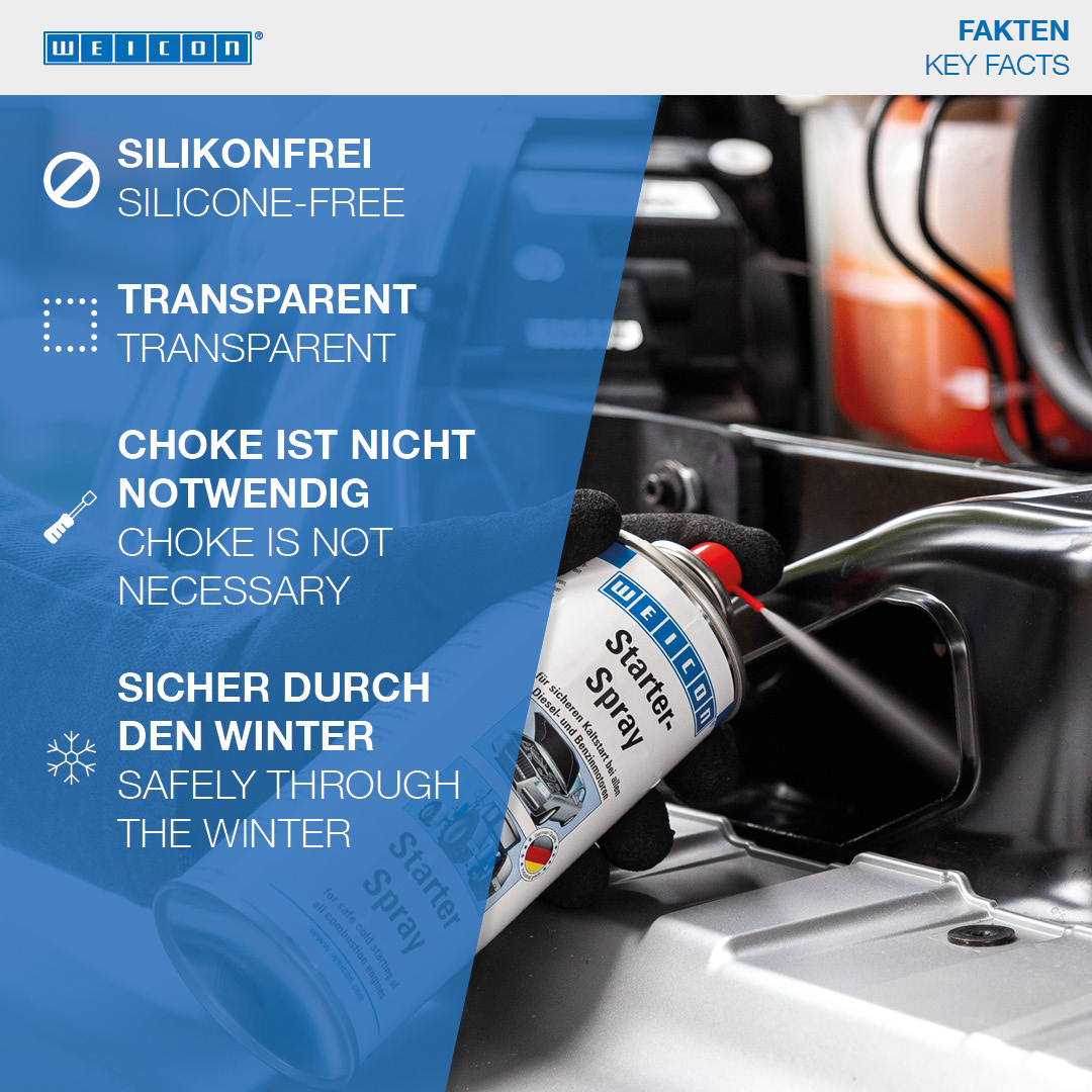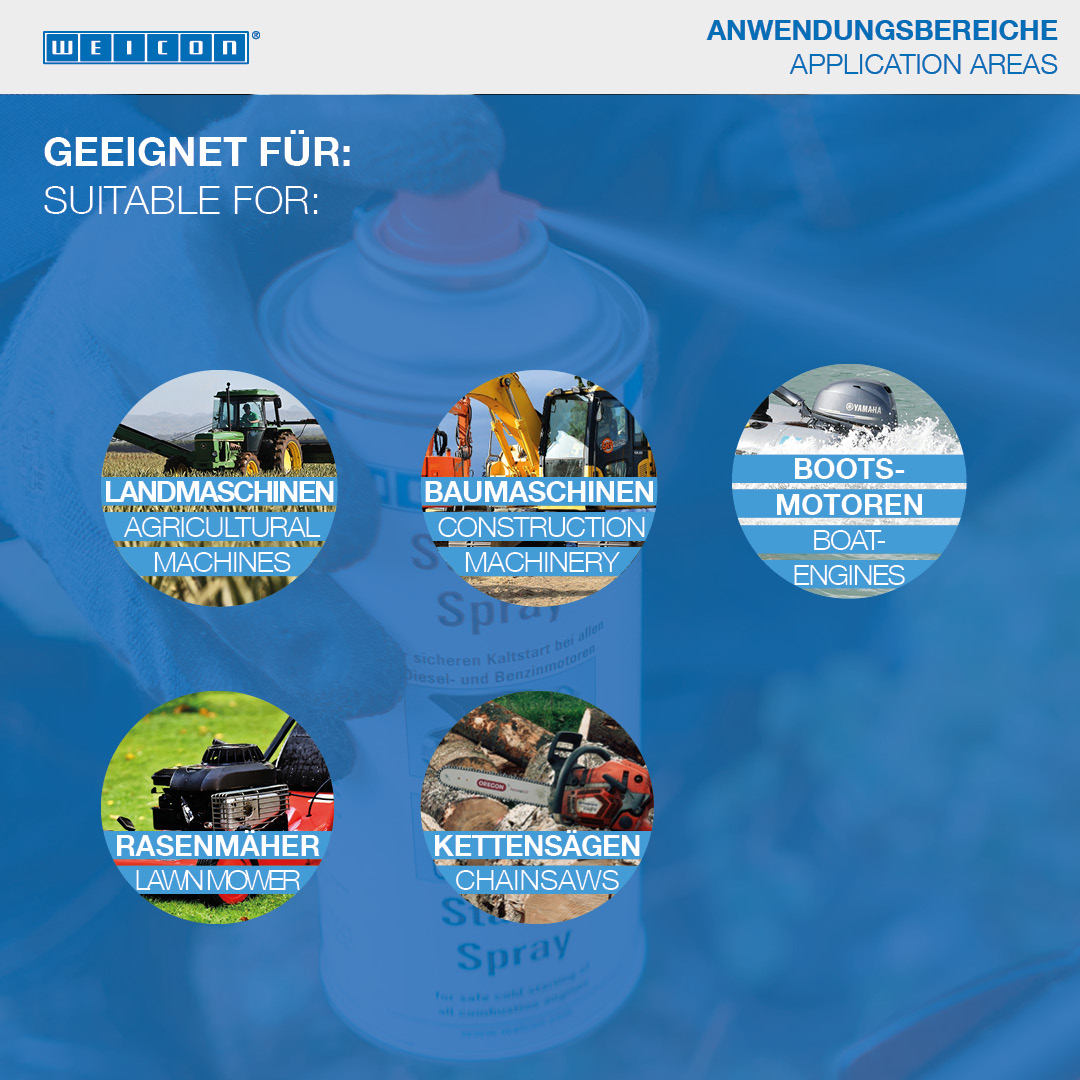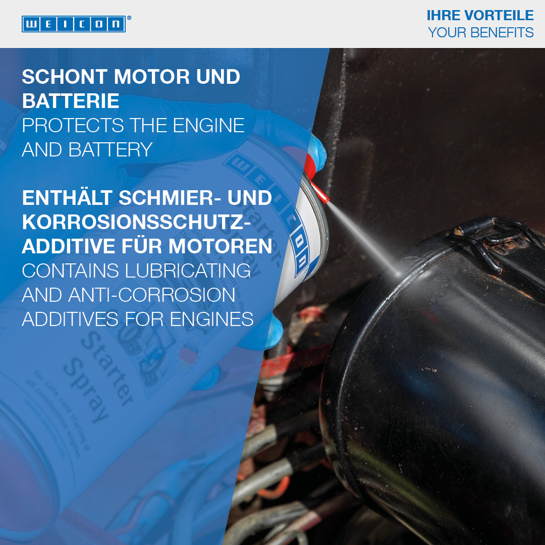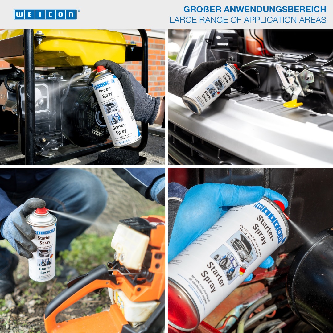Le Starter-Spray WEICON convient pour faciliter le démarrage sûr de moteurs à combustion interne. Une combinaison particulière d'agents actifs permet de faire démarrer à froid tous les moteurs. Le Starter-Spray s'utilise en particulier lors de basses températures, par temps humide ou après une longue immobilisation du véhicule, ménageant ainsi le moteur aussi bien que la batterie. Le Starter-Spray WEICON convient pour des moteurs Diesel et à essence. Avec ou sans catalyseur, pour des véhicules à moteur, machines de chantier ou agricoles, tronçonneuses à chaîne, tondeuses à gazon ou moteurs de bateaux, motos et les scooters.