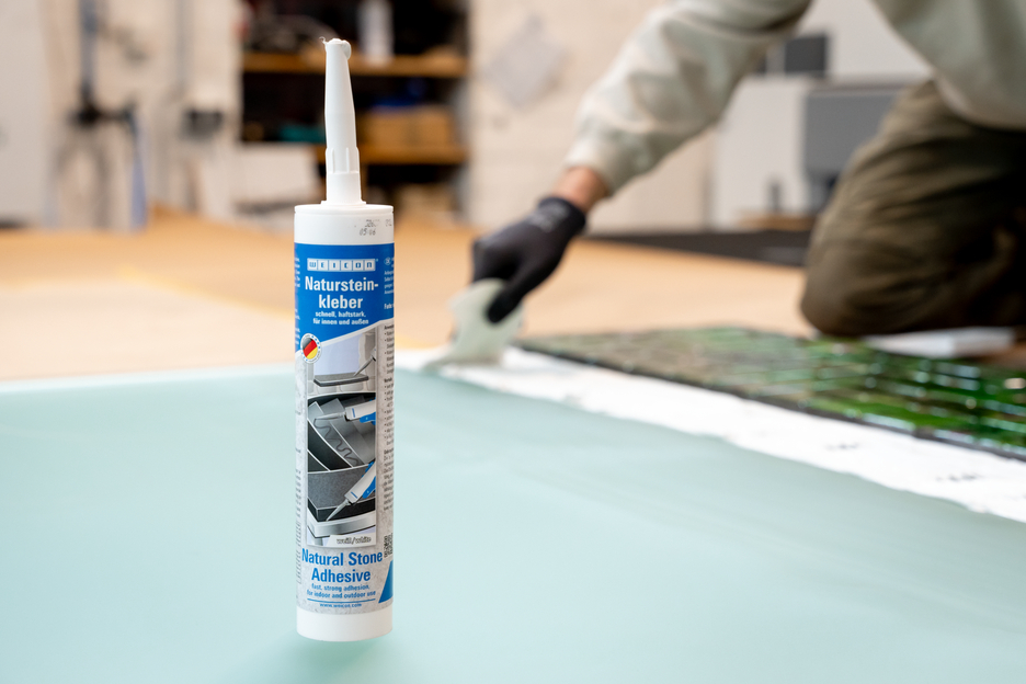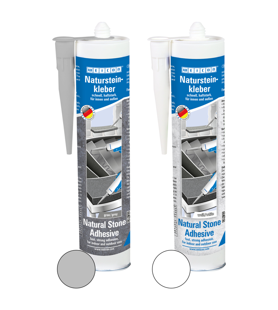 La colle WEICON pour Pierres Naturelles est une colle à forte adhérence pour le montage de pierres naturelles, de pierres et de céramiques. Grâce à sa très forte adhérence initiale et à la montée rapide du pouvoir adhésif, les collages sont possibles même sur des surfaces verticales, comme les murs. La colle à pierre convient à de nombreuses applications à l'intérieur et à l'extérieur. Elle résiste au gel, présente une résistance élevée aux températures de -40 °C à +90 °C ainsi qu'aux intempéries et aux UV. La colle pour pierres naturelles durcit rapidement et a une résistance finale très élevée. Après le durcissement, la colle peut être poncée et reste élastique, ce qui permet de compenser les mouvements. La colle à pierre est exempte de silicone, d'isocyanates, d'halogènes et de solvants. Elle peut être utilisée dans les applications les plus diverses - que ce soit pour le collage d'appuis de fenêtre, de carrelages, de plinthes, de plinthes décoratives ou de marches d'escalier. La Colle WEICON pour Pierres Naturelles adhère très bien sur les matériaux les plus divers, comme le bois, les matériaux dérivés du bois, les matières plastiques, les métaux, le verre et les supports minéraux. Elle est disponible en gris et en blanc.