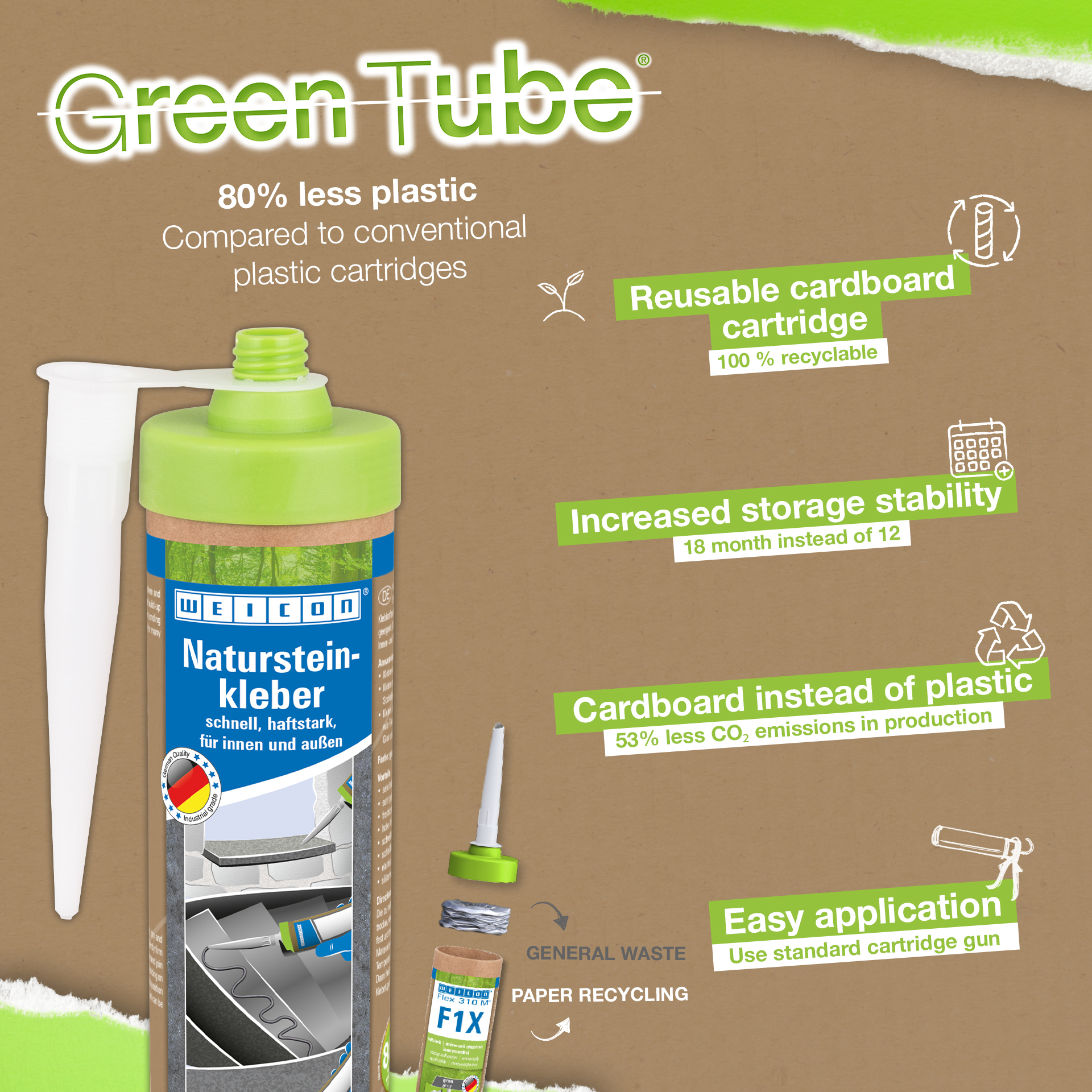 La colle WEICON pour Pierres Naturelles est une colle à forte adhérence pour le montage de pierres naturelles, de pierres et de céramiques. Grâce à sa très forte adhérence initiale et à la montée rapide du pouvoir adhésif, les collages sont possibles même sur des surfaces verticales, comme les murs. La colle à pierre convient à de nombreuses applications à l'intérieur et à l'extérieur. Elle résiste au gel, présente une résistance élevée aux températures de -40 °C à +90 °C ainsi qu'aux intempéries et aux UV. La colle pour pierres naturelles durcit rapidement et a une résistance finale très élevée. Après le durcissement, la colle peut être poncée et reste élastique, ce qui permet de compenser les mouvements. La colle à pierre est exempte de silicone, d'isocyanates, d'halogènes et de solvants. Elle peut être utilisée dans les applications les plus diverses - que ce soit pour le collage d'appuis de fenêtre, de carrelages, de plinthes, de plinthes décoratives ou de marches d'escalier. La Colle WEICON pour Pierres Naturelles adhère très bien sur les matériaux les plus divers, comme le bois, les matériaux dérivés du bois, les matières plastiques, les métaux, le verre et les supports minéraux. Elle est disponible en gris et en blanc.