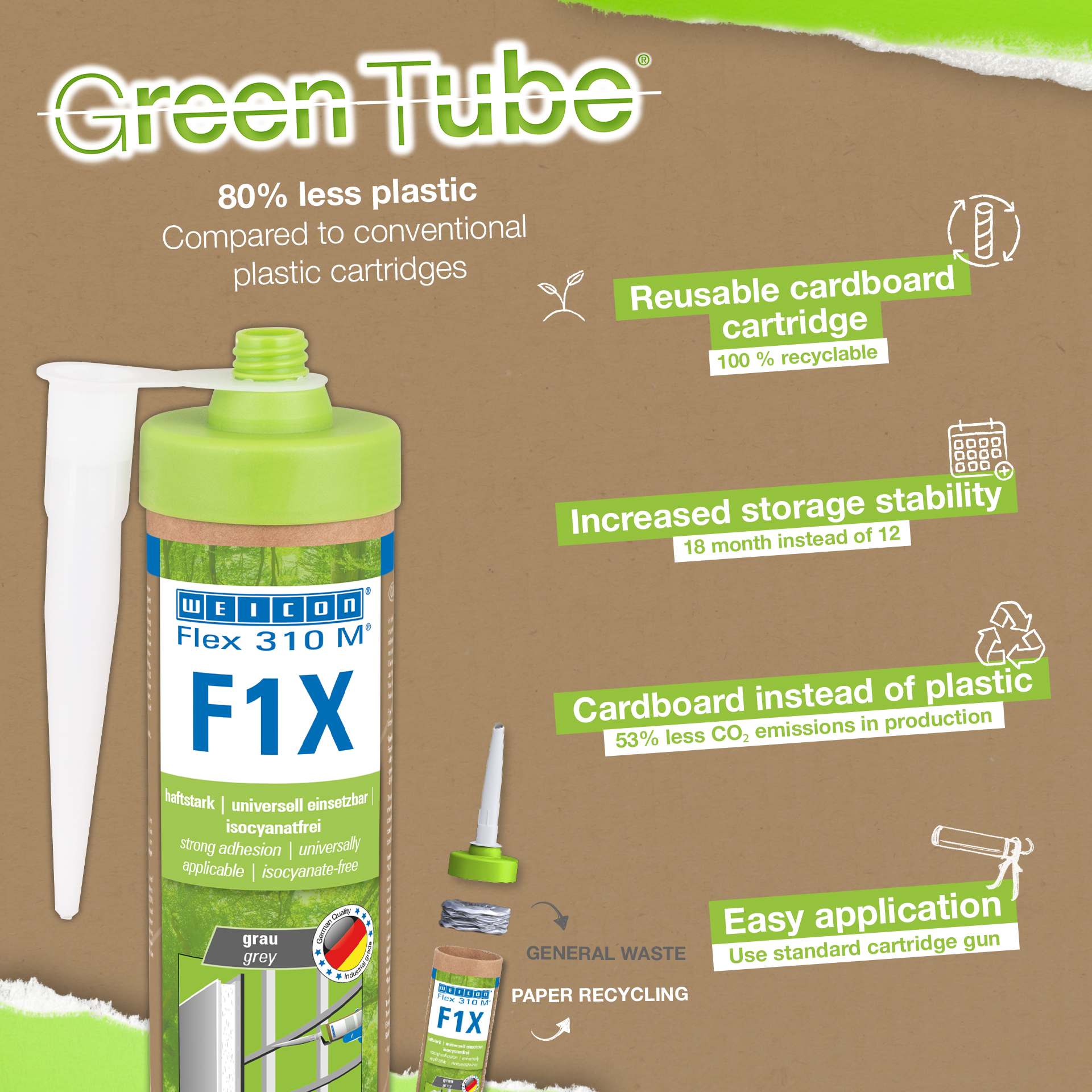 WEICON Flex 310 M F1X est une colle et un mastic d'étanchéité élastiques à base de MS-polymère. La colle grise est très adhérente et convient universellement pour la fixation durable de presque tous les matériaux sur une multitude de surfaces. Grâce à l'adhérence initiale très élevée, des collages sur des surfaces verticales et même au-dessus de la tête sont possibles à l'intérieur et à l'extérieur. Par exemple, les métaux, de nombreuses matières plastiques, la céramique, le bois, le verre et la pierre peuvent être assemblés entre eux ou avec Flex 310 M F1X. La colle à élasticité permanente peut être peinte « mouillé sur mouillé », est résistante au ponçage, aux intempéries, à l'humidité, au vieillissement, aux moisissures et aux UV. Il résiste brièvement (jusqu'à 30 minutes) à des températures allant jusqu'à 180 °C et peut être revêtu de poudre après un temps de durcissement de quatre jours. Ce scellant adhésif d’étanchéité est exempt de silicone, d’isocyanate, d’halogène et de solvants et n'est pas corrosifs. Flex 310 M F1X peut être utilisé pour fixer des plinthes, des lattes, des bandes, des cadres, des panneaux, des plaques, des carreaux, des pierres et un film EPDM. Il peut être utilisé dans la construction sèche et l'aménagement intérieur, la construction métallique, la construction de réservoirs et d'appareils, la construction de conteneurs, la ventilation et la climatisation, l'aménagement de salons et de magasins, la construction de yachts et de bateaux et partout où les silicones ou les produits contenant des silicones ne sont pas adaptés. Emballage durable - même efficacité ! Green Tube, l'emballage durable : l'embout et le couvercle sont composés à 100 % de plastique recyclé, le corps de la cartouche à 100 % de carton. Moins d'émissions de CO2 et de consommation de plastique que les cartouches traditionnelles. Sans faire de compromis sur les performances !
