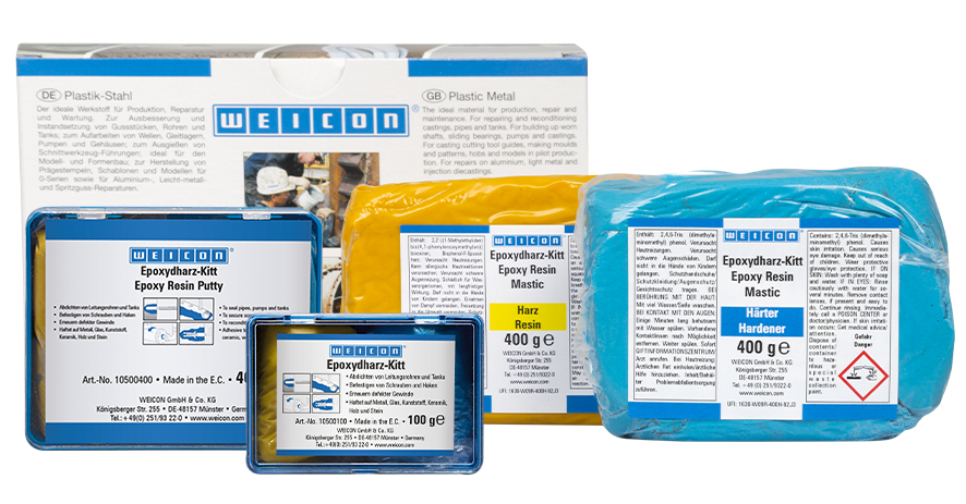 WEICON Epoxy Putty est un composé à deux composants, pétrissable et sans métal. Le produit est polyvalent dans son utilisation. Il convient à la réparation et à la remise en état de pièces moulées, à la remise en état d'arbres, de paliers lisses, de pompes et de boîtiers, à la rénovation de filets défectueux, à la fabrication de gabarits et de modèles et à la réparation d'aluminium, de métaux légers et de moulages par injection. Le composé peut être utilisé pour l'étanchéité des conduites et des réservoirs et pour la fixation de vis et de crochets. Il peut être utilisé pour éliminer les dommages causés par la corrosion et les piqûres ou pour réparer les trous et les soufflures. Le mastic à base de résine époxy adhère particulièrement bien à tous les métaux ainsi qu'à la céramique, au verre, à la pierre, au béton, au bois, au caoutchouc et à de nombreux plastiques. Une fois durci, le mastic époxy WEICON se travaille mécaniquement, se peint et résiste à l'essence, à l'huile, aux esters, à l'eau salée et à la plupart des acides et des alcalis. Il résiste à des températures élevées, jusqu'à +200 °C (+392 °F), est non magnétique et non corrosif. Grâce au simple rapport de mélange de 1:1 en poids et en volume, la résine et le durcisseur peuvent être très facilement dosés dans la quantité souhaitée. Le mastic de résine époxy WEICON s‘utilise aussi dans la construction de machines, d‘outils, de modèles et de moules ainsi que dans beaucoup d‘autres domaines industriels.