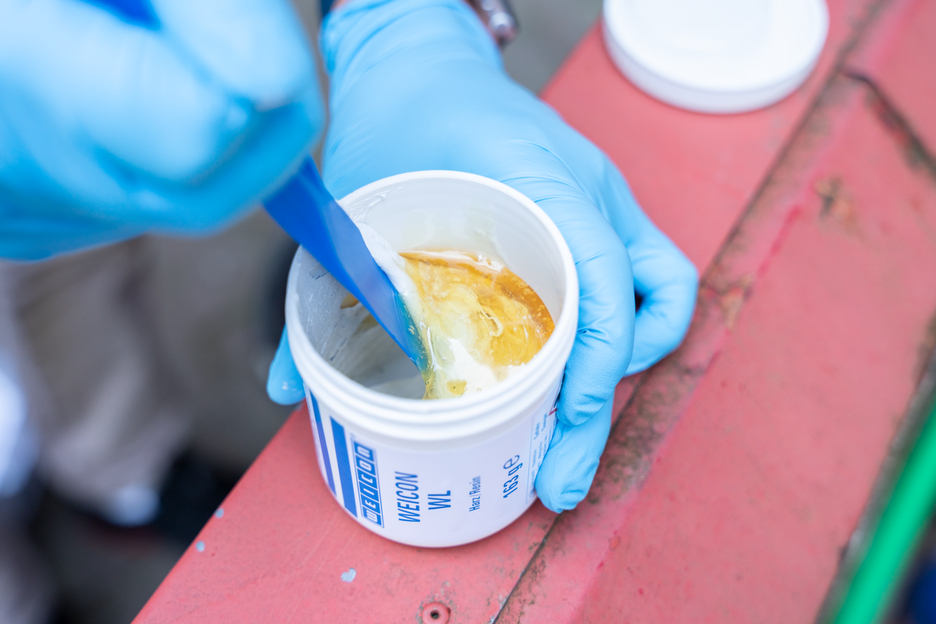Le système de résine époxy WEICON WL sert à revêtir des surfaces sollicitées. Il est liquide, pulvérisable, pouvant être peint (à appliquer au pinceau), possède une grande force d'adhérence, en particulier sur l'acier inoxydable, est rempli de céramique et résiste aux produits chimiques. Grâce à sa longue durée d'utilisation, WEICON WL peut être utilisé pour des applications avec des températures ambiantes plus élevées ou pour des surfaces plus importantes. WEICON WL convient bien pour une structure de système en combinaison avec d'autres types de plastique-acier. Par exemple, la résine époxy bicomposante peut servir de couche de fond pour le revêtement de boîtiers de pompe en acier inoxydable fortement sollicités. Le revêtement de surface peut être utilisé dans la construction de machines et d'installations, dans la construction d'appareils ainsi que dans de nombreux autres domaines de l'industrie.