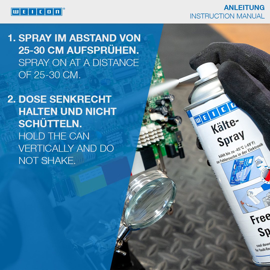 WEICON Freeze Spray has many uses and is suitable for fault-finding in electronics and for repair works in the industrial sector. Freeze Spray quickly cools parts down to -45 °C and allows pinpointed chilling of even the smallest construction parts. WEICON Freeze Spray is non-conductive and neutral to materials (with the exception of plastic) and can be used in many industrial and technical applications.