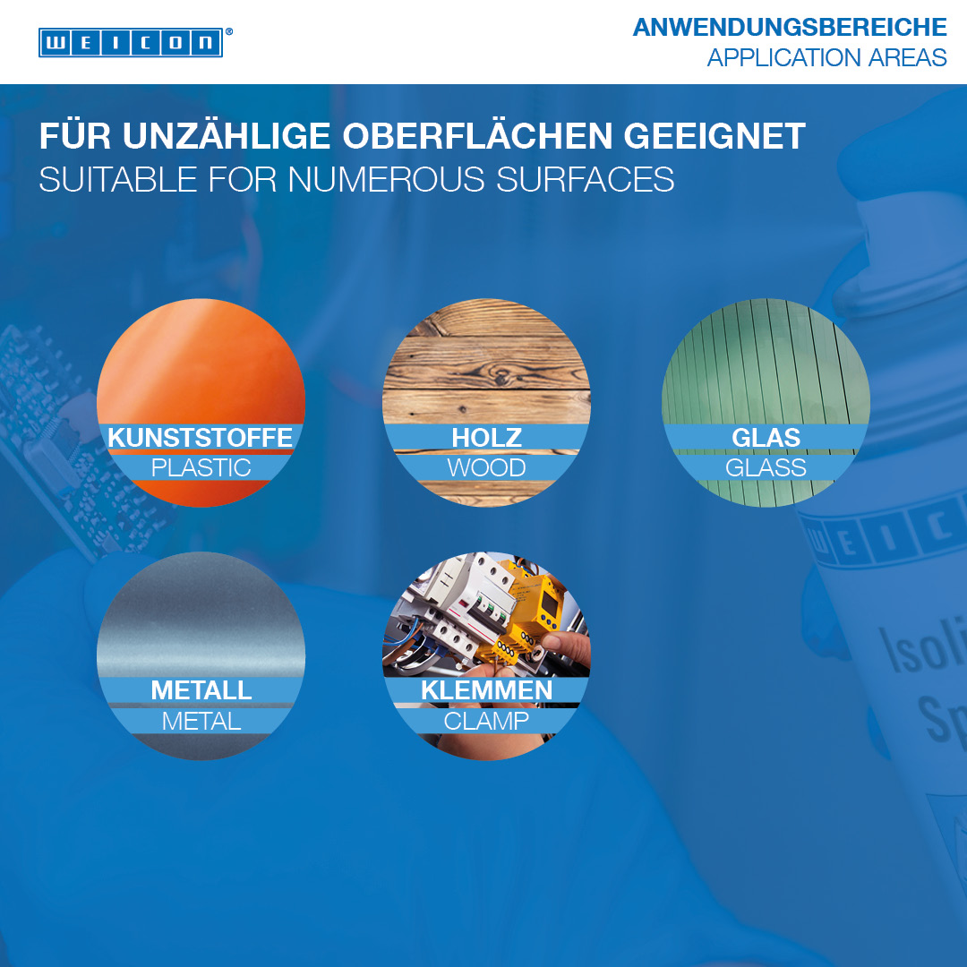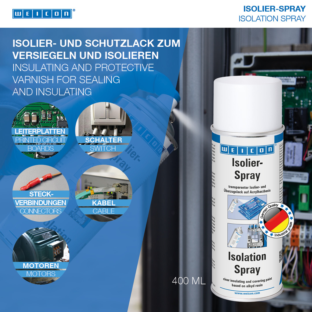 WEICON Isolation Spray is a transparent insulating and finishing varnish based on acrylic resin. It forms a flexible and resistant layer, which shows excellent adhesion to metal, glass, plastic or wood. It is resistant to UV radiation, acids, oils and lyes. It is moisture- and weather-resistant and stands out particularly due to its high dielectric strength. The spray protects against moisture as well as different vapours. It can be used as protective coating for circuit boards, on electrical connections, switches, switchboards, electronic components and coils, as universal sealant in electrical engineering or for the repair of insulations on electric motors, windings and frames.