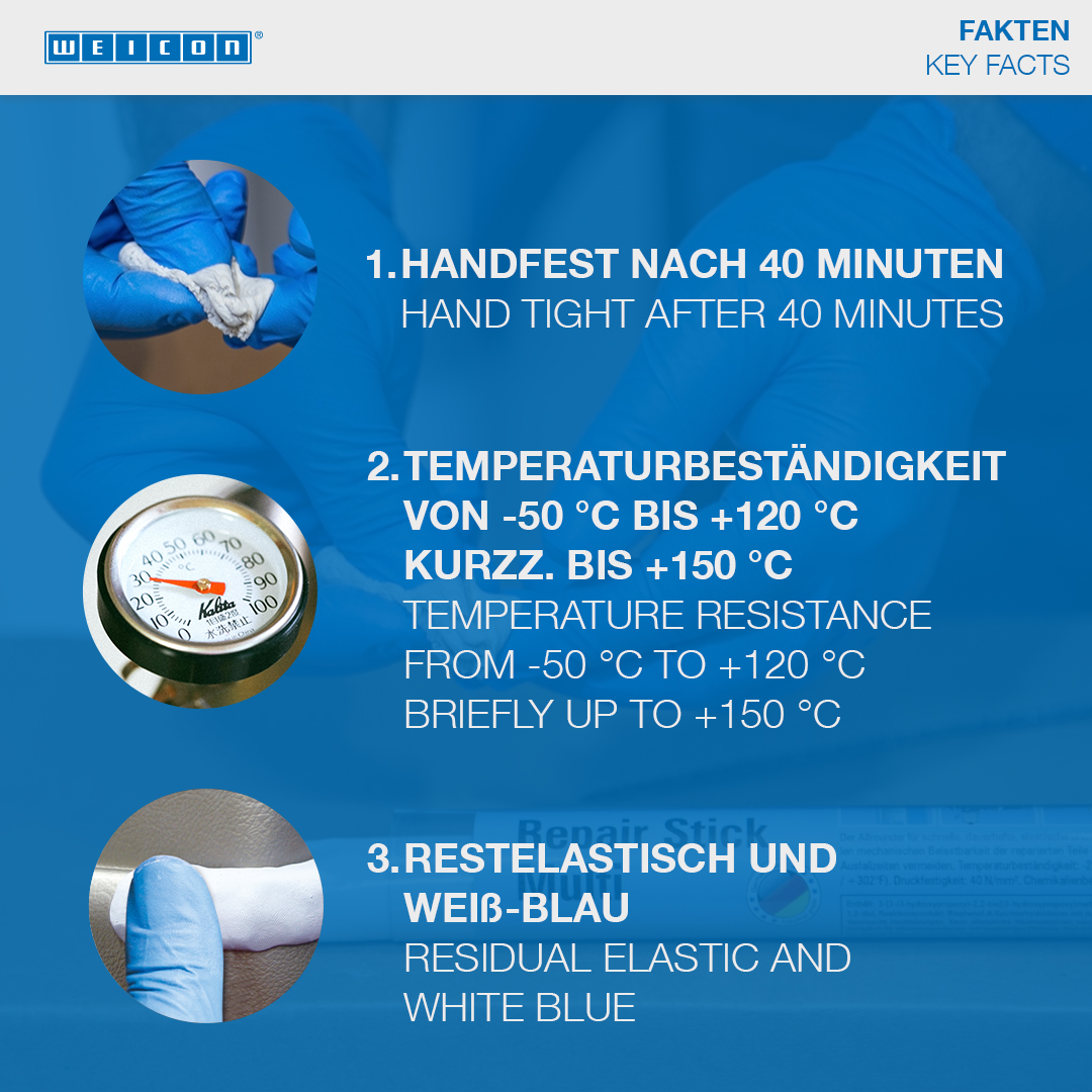 WEICON Repair Stick Plastic was developed specially for the permanent repair of plastic components and composite materials with residual elasticity such as window and door frames, panelling and bumper bars. It is suitable for bonding metal pieces, such as pipes and pipe bends, fittings and flanges, water tanks, pumps and housings. The Repair Stick can be used in tank construction and apparatus engineering, in the food, cosmetics and pharmaceutical industries and in many other applications.