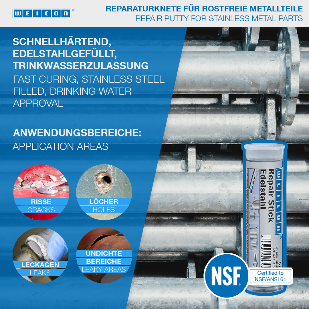 For the non-corrosive repair and reconditioning of stainless steel and other rustproof metals, such as used in tanks and containers, filling and packing machines, pipes, pipelines, pumps and housings. Due to the quick mechanical loading capacity of the mended parts (approx. 60 minutes), expensive and longer downtimes are avoided. The WEICON Repair Stick Stainless Steel can be used in tank construction and apparatus engineering, in the foods, cosmetic and pharmaceutical industries and in many other areas. Due to its special formula and the resulting NSF registration, the Repair-Stick can contribute towards improvements in occupational safety and health protection.