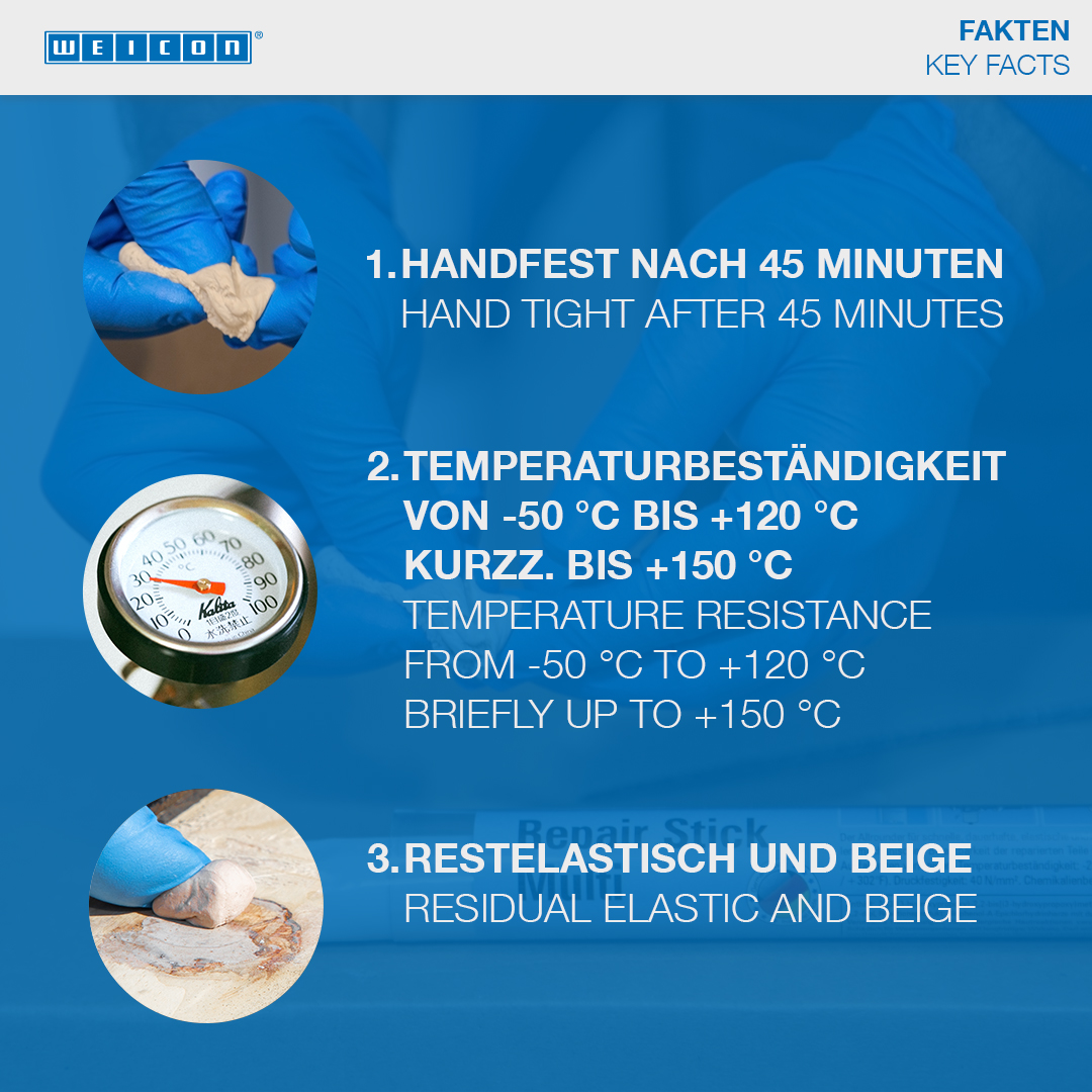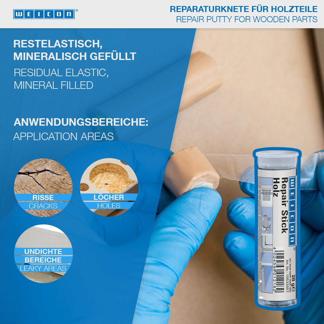 For permanent repairs of wooden parts with residual elasticity and without shrinkage. For the repair of cracks and bore holes, broken out or broken off wooden parts and for the sealing of joints on windows and door frames, veneers, boards and planks, models and wooden toys. WEICON Repair Stick Wood can be used in the wood and furniture industry, in model building and in many other areas.