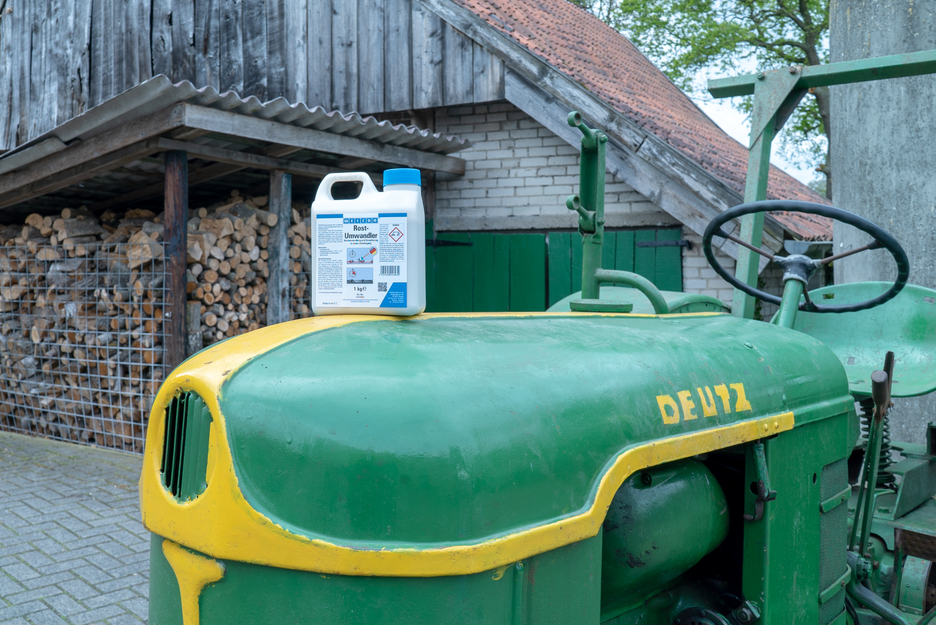 WEICON Rust Converter neutralises rust on corroded iron and steel surfaces and reliably stops corrosion. With its special formula of acid and tannin, the rust converter penetrates the rust. It chemically converts iron oxides into a stable layer and provides temporary corrosion protection through zinc phosphate. Depending on the carbon content of the metal, the treated area changes colour to bluish, brownish or black. The layer provides the perfect base for subsequent protective coatings, e.g. with WEICON Zinc Spray. WEICON Rust Converter achieves optimal results on lightly rusted surfaces with a rust grade of A and B. Loose rust and loose parts should be removed mechanically beforehand. The converter only becomes active when applied to rust or metal and can be used extensively on all rusted areas, such as on machines and equipment, agricultural machinery and motor vehicles. Unlike other converters, WEICON Rust Converter can be washed off the treated surface with clean water and a sponge or soft brush once the reaction time is over. This way, residues that have formed during the conversion process are removed.
