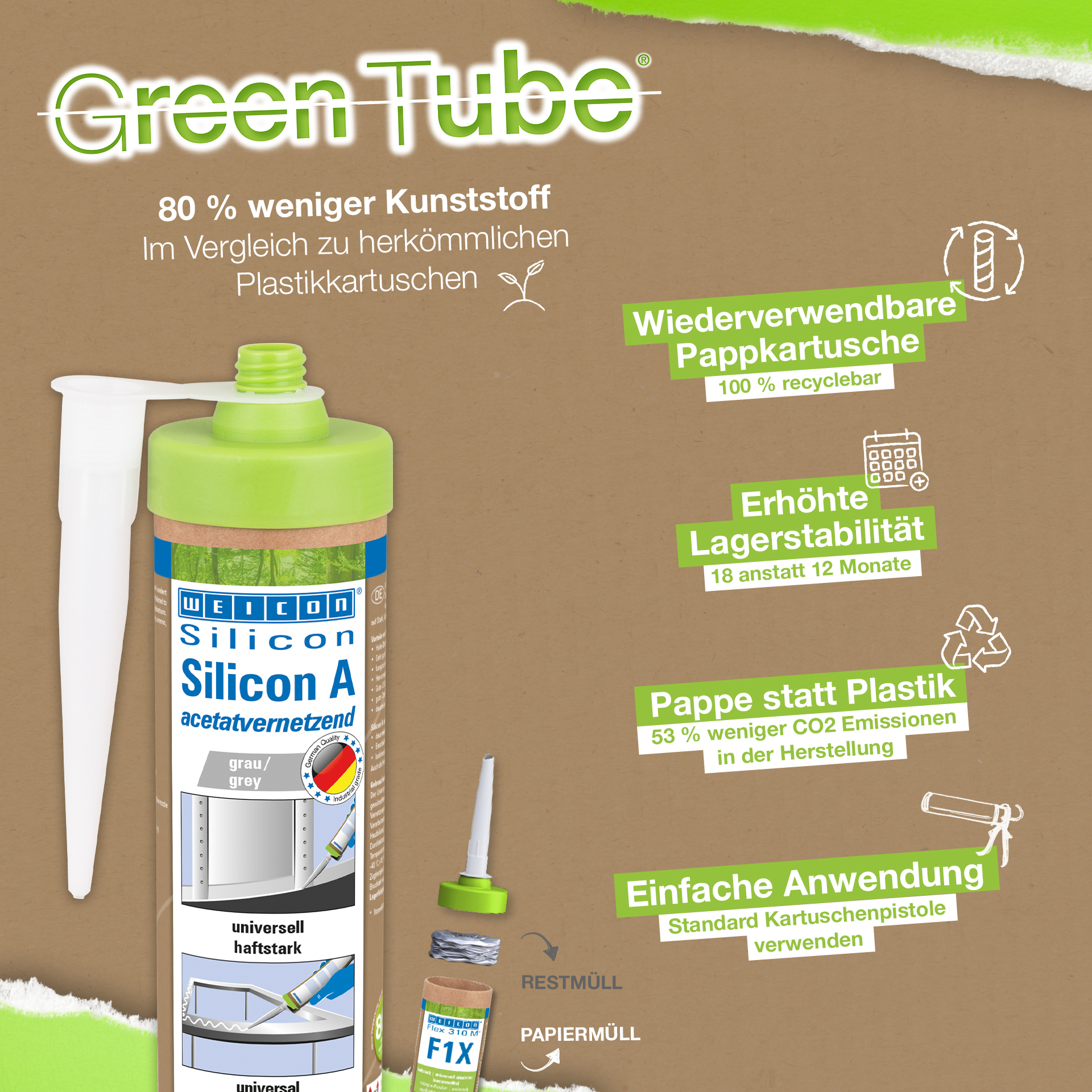 WEICON Silicone A is solvent-free, acetoxy-curing, strong, permanently elastic, resistant to ageing and chemicals, temperature-resistant up to +180 °C (+356 °F), extremely elastic (breaking elongation >700%) and can be used universally. Silicone A adheres very well to steel, aluminium, glass, ceramics, and many other materials. Silicone A can be used in machine and system construction, ventilation and air conditioning systems, in the energy and electrical industry, in exhibition construction and shopfitting and in many other industrial applications.