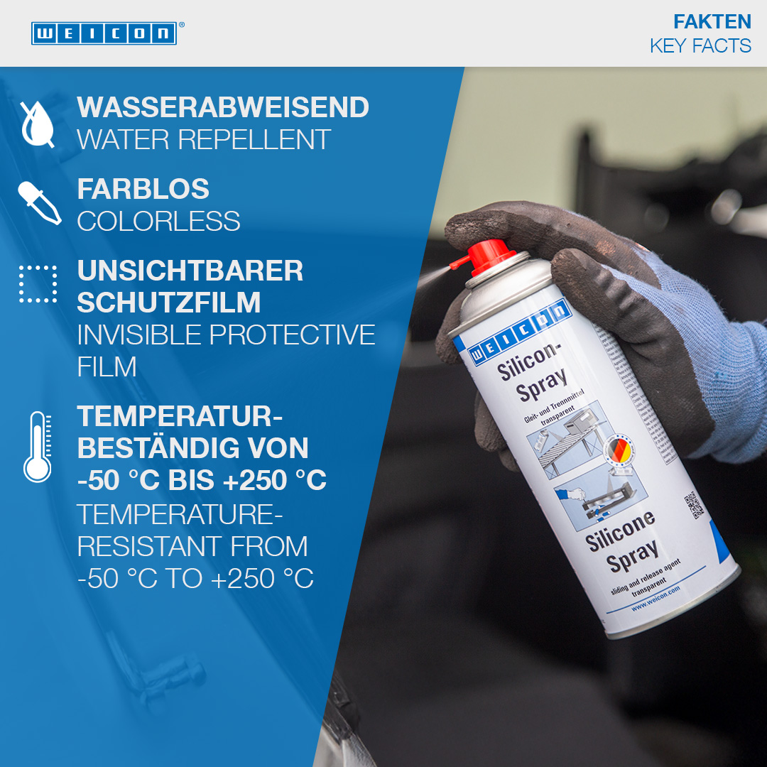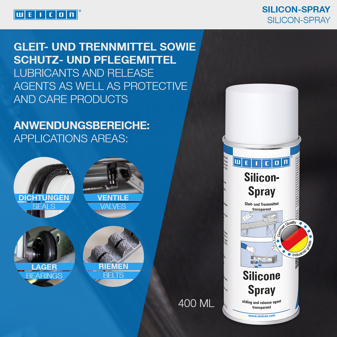 WEICON Silicone Spray is a sliding and release agent as well as a preservative and care product for plastic, rubber and metal. The spray provides a durable separating film and good surface properties and is temperature-resistance up to +250 °C (+482 °F). Silicone Spray prevents the formation of adhesive residues on presses and guides, prevents products from sticking to conveyor belts, chutes and sliding ways, protects electrical contacts from moisture, preserves rubber, plastic and metal parts, protects rubber parts from becoming brittle, freezing and sticking, and allows sunroof rails, seat tracks and seatbelt to run smoothly.