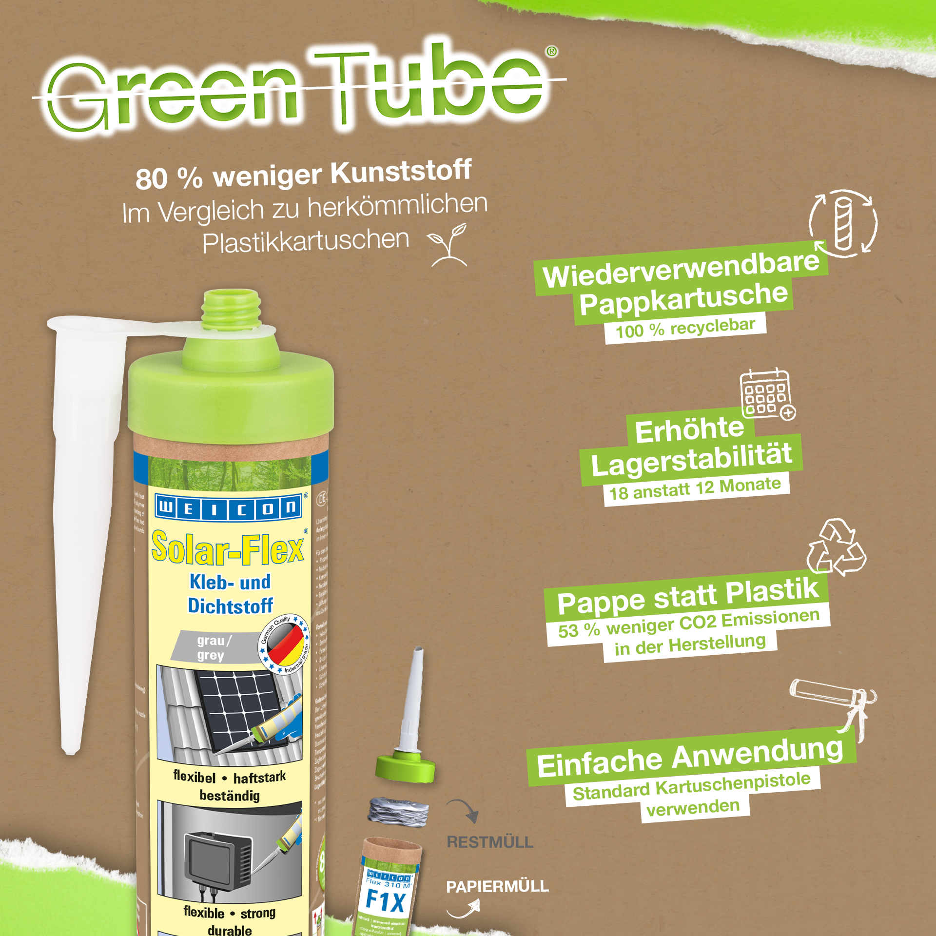 WEICON Solar-Flex is strong, non-corrosive, paintable (wet-on-wet), weather-resistant and resistant to UV rays. It is free of silicone, isocyanate, halogens and solvents. Solar-Flex is an elastic adhesive based on MS polymer specially developed for the solar industry. Both the very high initial bonding power and the fast development of adhesive strength enable bondings even on vertical surfaces. Replaces traditional fixings in the assembly of solar and photovoltaic power systems.
