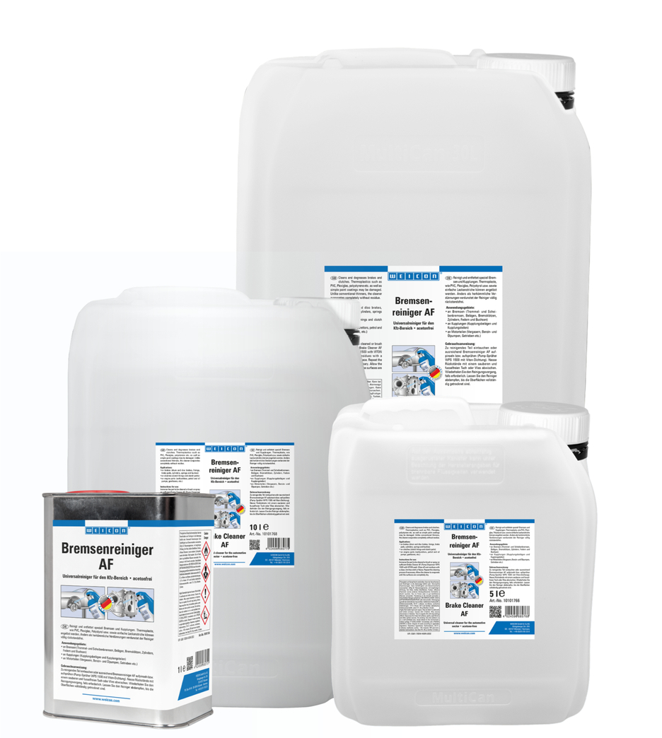 WEICON Brake Cleaner AF is an acetone-free universal cleaner for the automotive sector. The liquid agent cleans, degreases and evaporates completely without residue. Brake Cleaner AF quickly and effortlessly degreases and cleans metals, glass, rubber materials, powder-coated surfaces and many plastics and reliably removes oil and grease soiling and residues. The cleaner can be used on brakes (drum and disc brakes, linings, brake pads, cylinders, springs and bushes), clutches (clutch linings and parts) or engine parts (carburettors, petrol and oil pumps, gearboxes, etc.). However, it is also suitable for cleaning plastic profiles, seals or painted surfaces and can be used in many areas of industry and trade.