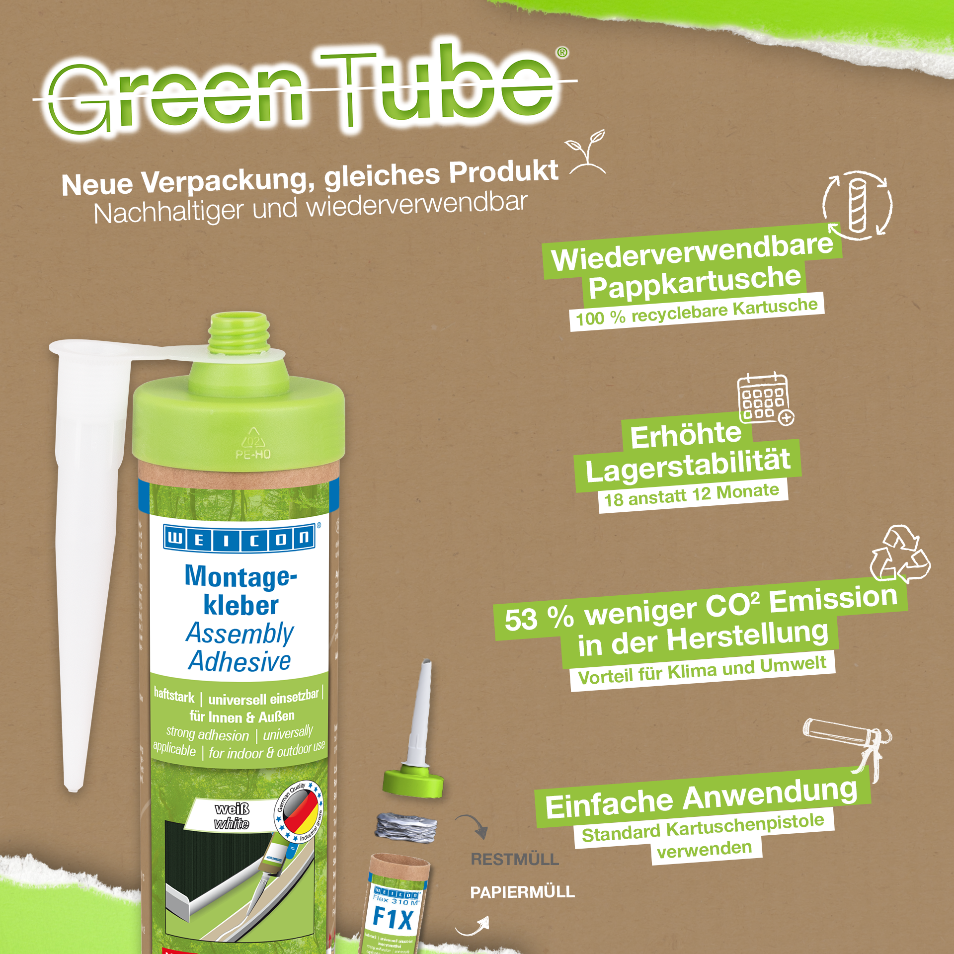 WEICON Assembly Adhesive is a strong dispersion acrylic adhesive for assembly, repair and touch-up work. The adhesive has a high initial adhesion and final strength and cures rapidly. After drying, the Assembly Adhesive can be sanded and plastered over and can be painted over with commercially available paints and varnishes. The adhesive is temperature-resistant in a range from -20°C to +80°C and is suitable for both indoor and outdoor applications. The white flexible adhesive is low-emission and free from solvents. The Assembly Adhesive is universally applicable and can be used for a wide variety of applications. It is ideal, for example, for surface bonding of wood-based materials (such as skirting boards, decorative mouldings, panels or chipboard), PVC, polystyrene, polystyrene foam boards, PU rigid foam (e.g. insulation boards and cable ducts), mineral materials (e.g. tiles) and metals on absorbent substrates such as plaster, concrete, fibre cement, plasterboard and untreated wood.