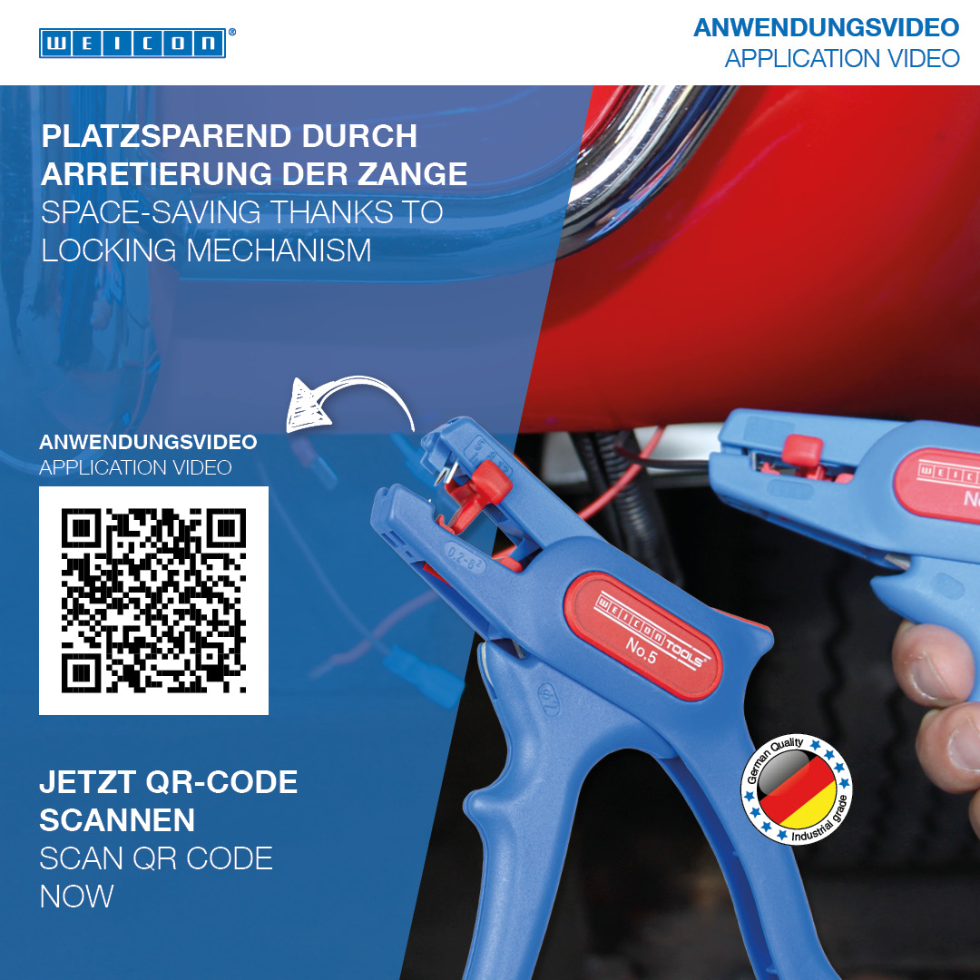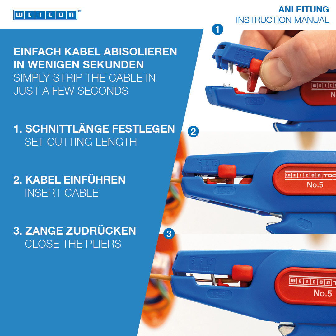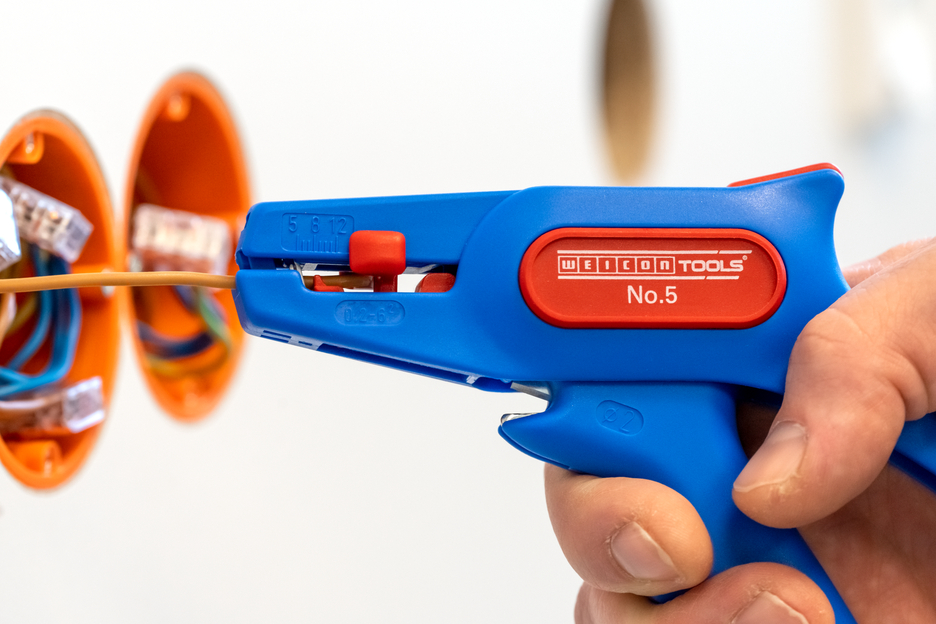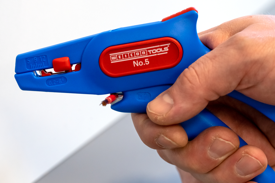 The WEICON Wire Stripper No. 5 is suitable for stripping all stranded and solid conductors from 0.2 – 6.0 mm². The wire stripper also has a visual length scale from 5 - 12mm. The length stop can be removed, if required. A well-accessible side cutter is integrated in the tool, which is suitable for cable diameters up to 2 mm. The blades are replaceable. The low weight of the No. 5 ensures fatigue-free working.